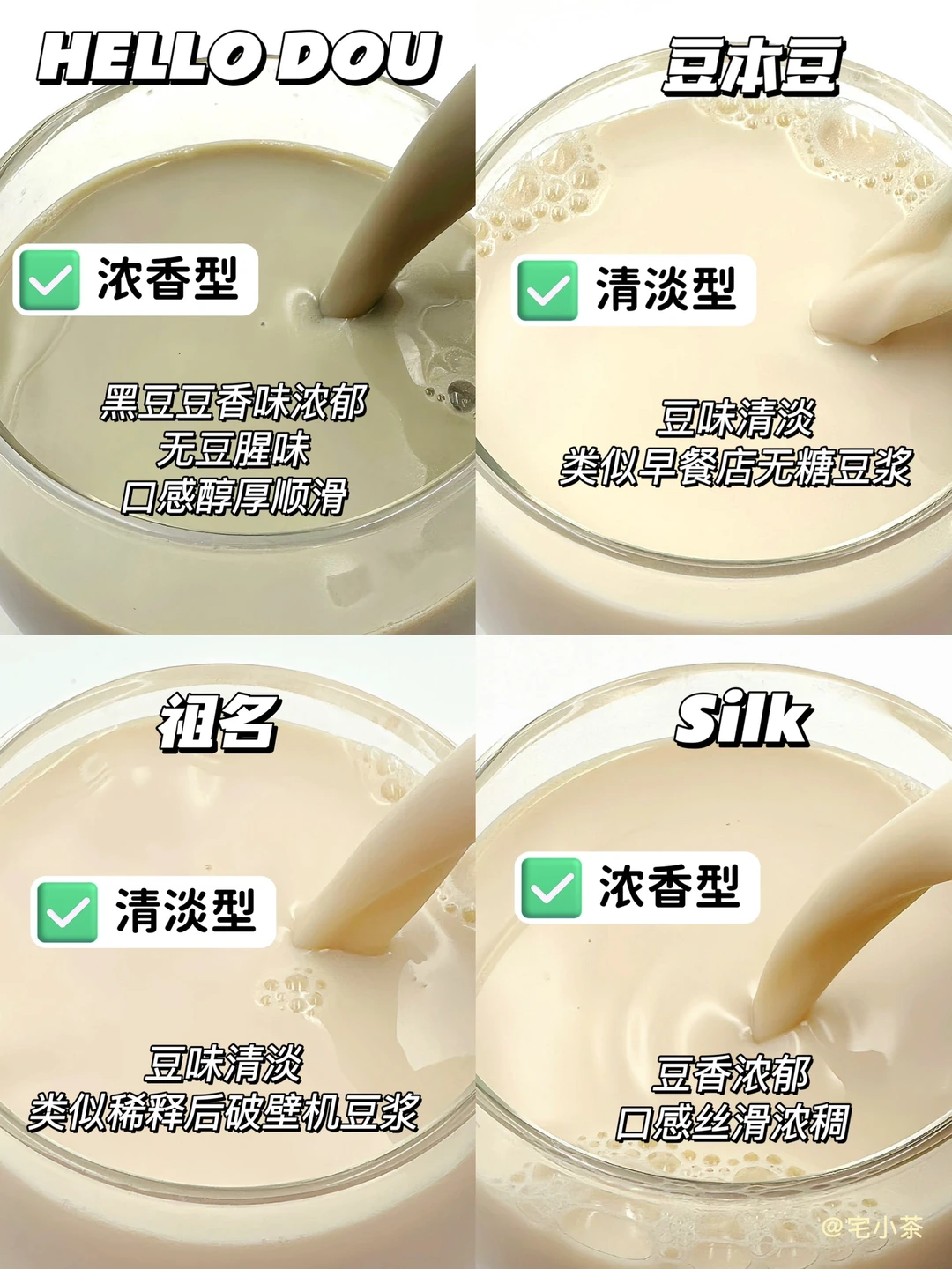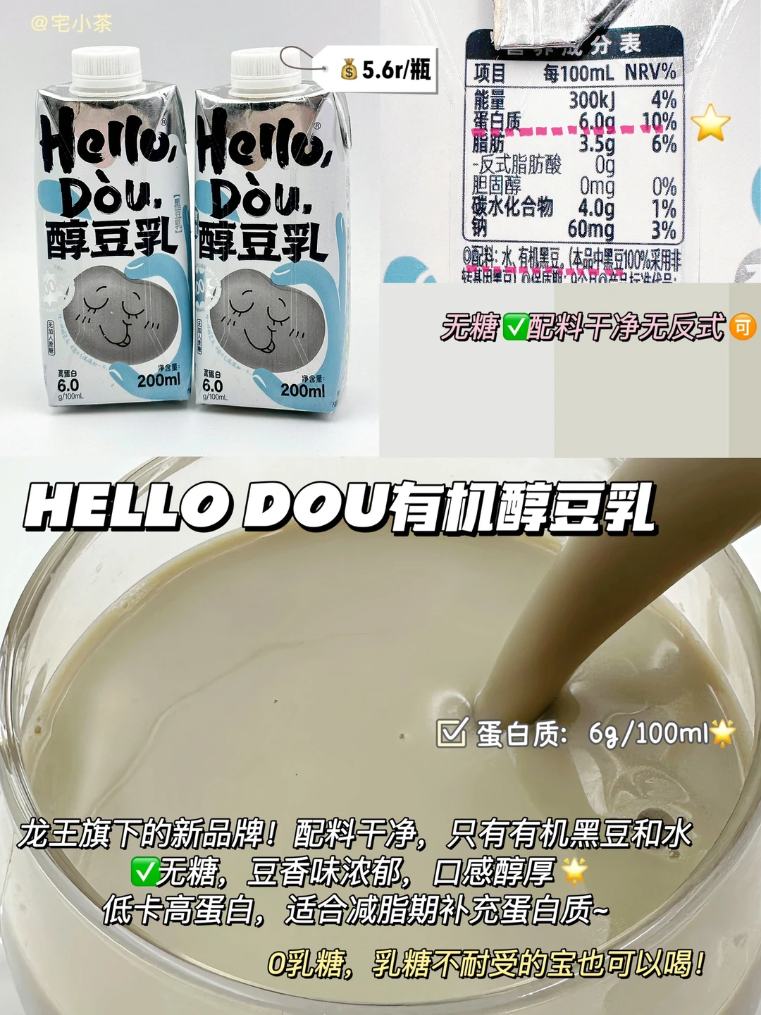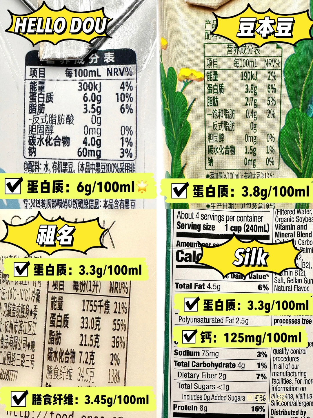 👉总的来说,喜欢浓郁豆香型就选HELLO DOU和Silk,豆香浓郁,口感浓稠,清淡型就选豆本豆和祖名。其中HELLO DOU属于低卡高蛋白豆奶,减脂人和乳糖不耐受都能喝,个人很爱,也是家里经常囤的一款,小瓶装上班带去公司也方便~而且包装超可爱,家有小孩的闭眼冲!