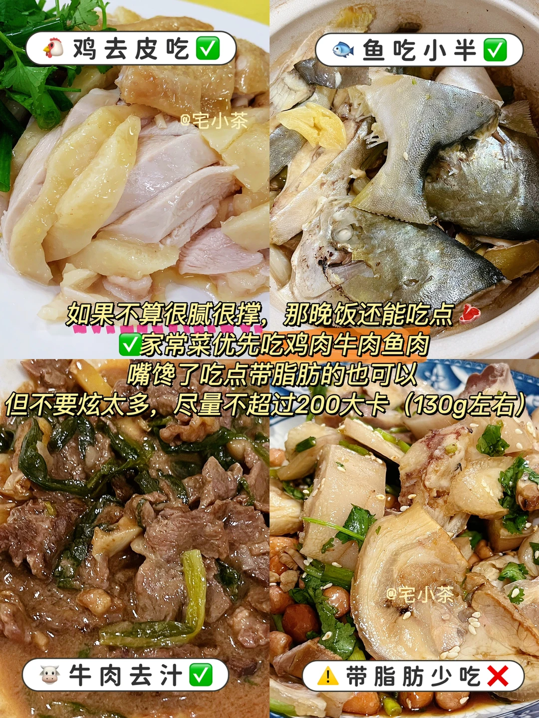 5️⃣吃肉优先选鸡肉牛肉鱼肉,嘴馋了吃点带脂肪的也可以,但不要炫太多,热量不超过200大卡。
