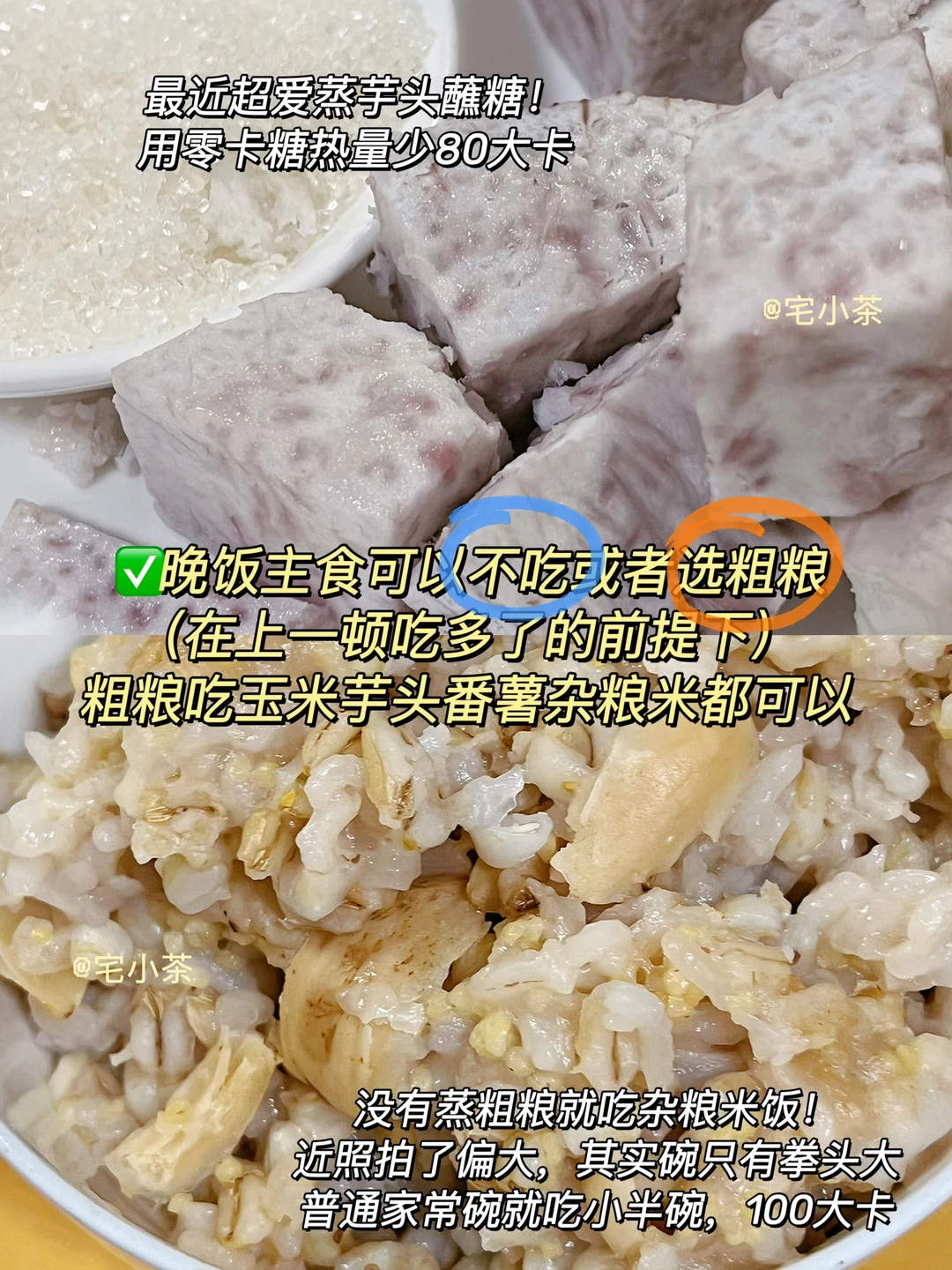 6️⃣晚饭主食可以不吃或者选粗粮(在上一顿吃多了的前提下),玉米芋头番薯杂粮米都可以,吃小半碗/一拳就行,100大卡。