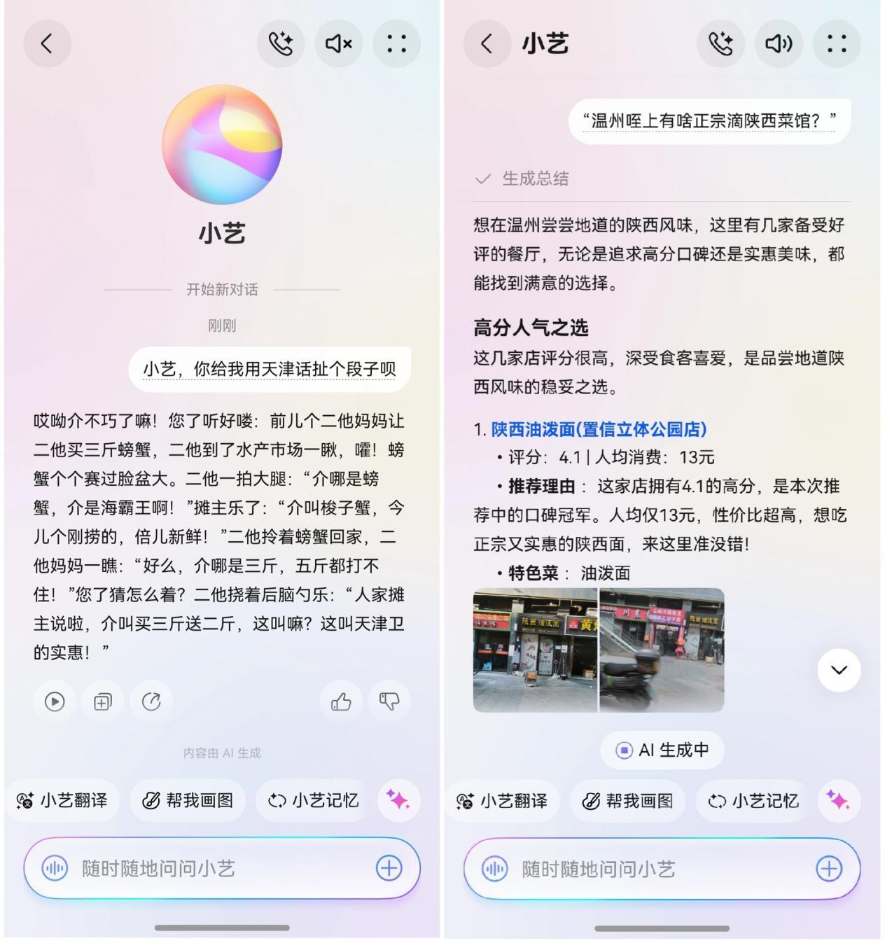 舅舅也操着陕西话问“温州咥上有啥正宗滴陕西菜馆?”小艺不仅能秒切地区,给出的答案还超级详细,评分、营业时间、推荐理由、特色菜都一目了然,那叫一个细心体贴。不得不说这种亲切自然的交互体验,让AI都染上了热络的人情味。