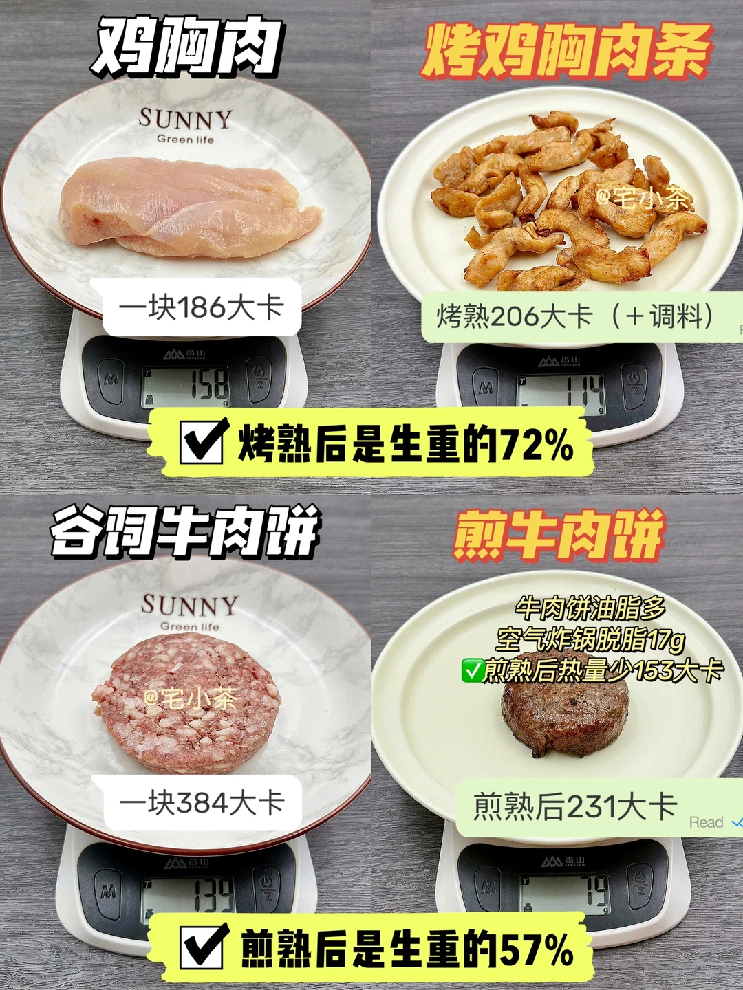 ②碳水或蛋白质占比高的食材,如粗粮、鸡胸肉、鲜虾等,烹饪后的热量是它的生重热量+你所添加的调料热量;如果烹饪时不添加任何调料,那么烤熟前后热量不变。