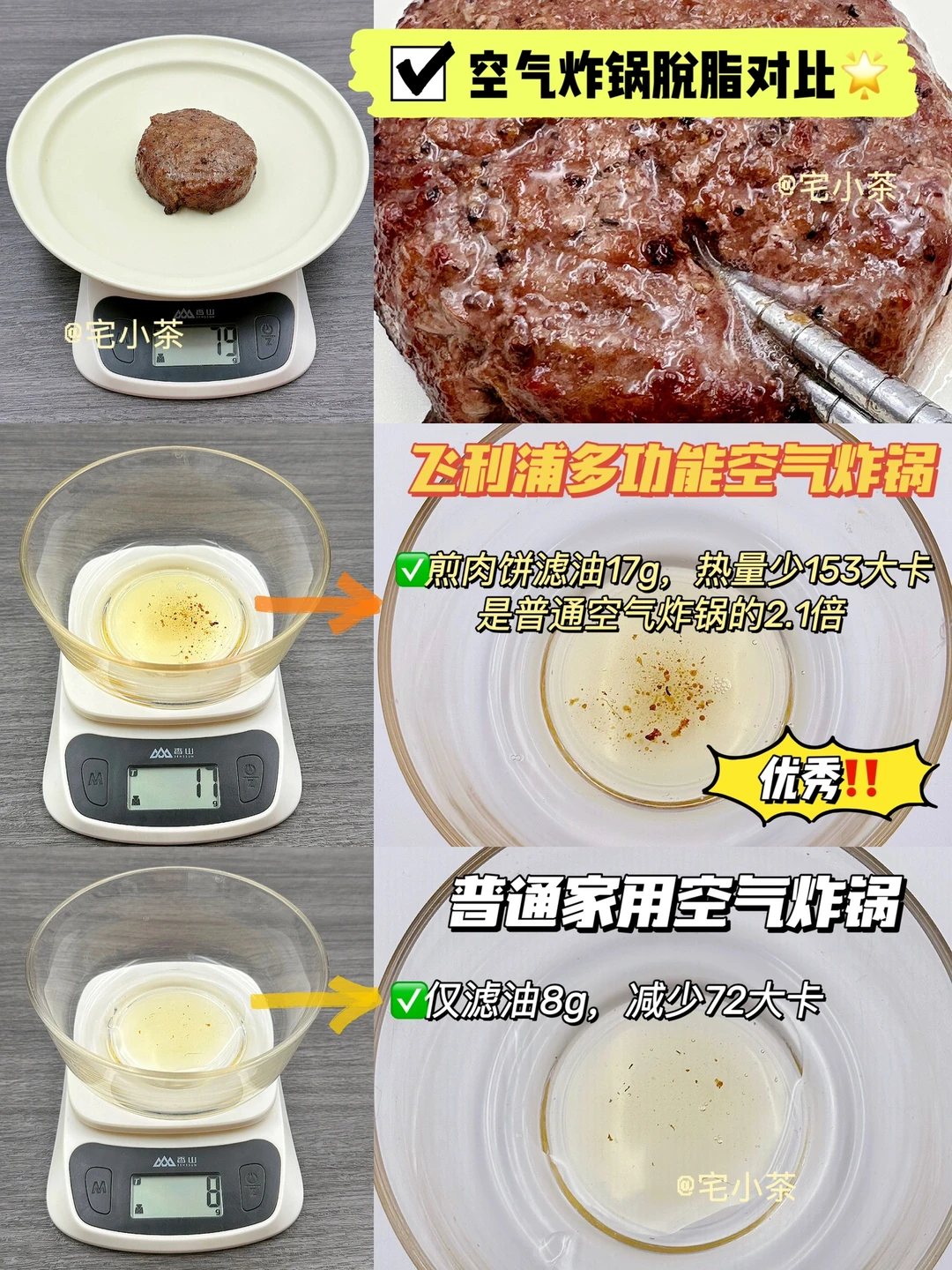 🔸使用飞利浦多功能空气炸锅煎熟,牛肉饼可脱脂17g,热量减少153大卡,一块仅231大卡