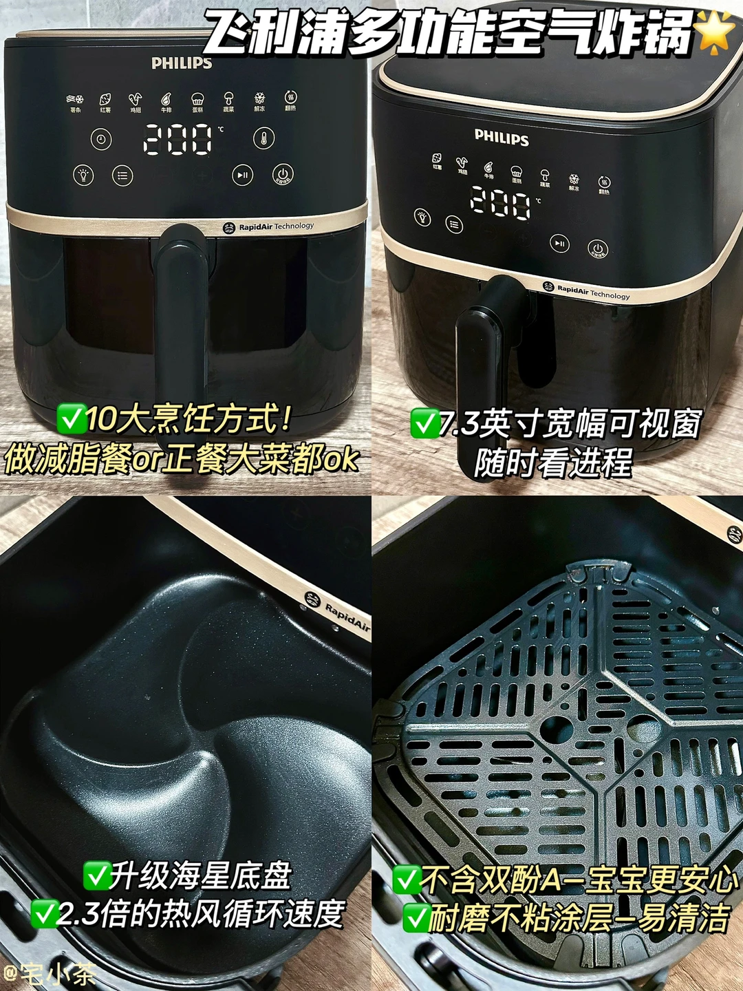 ①飞利浦的升级海星底盘是2.3倍热风循环速度,食材不需要翻面也能加热均匀,做减脂餐or正餐大菜都没有压力。而且比起传统烹饪,它的脱脂率能达到89%,脱油能力≈普通炸锅的 2 倍,对减脂人很友好!