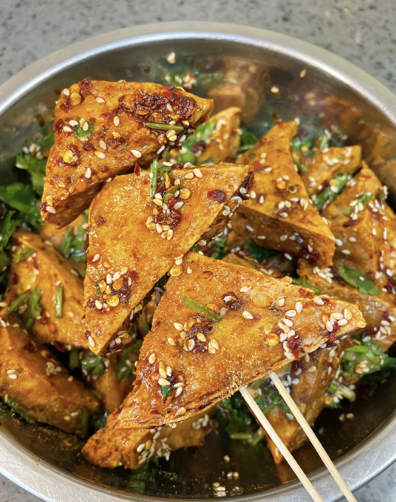 拌好的香辣脆皮豆腐,刚一上桌就香迷糊了,金黄酥脆的外皮上撒着雪白的芝麻和鲜红的辣椒面,翠绿的香菜点缀其中,光是看着就让人食欲大开。夹起一块放进嘴里,外层的酥脆和内里的软嫩形成鲜明对比,咸香、微辣、孜然的香气在嘴里交织,越嚼越香,配上一碗白米饭,简直是下饭神器。