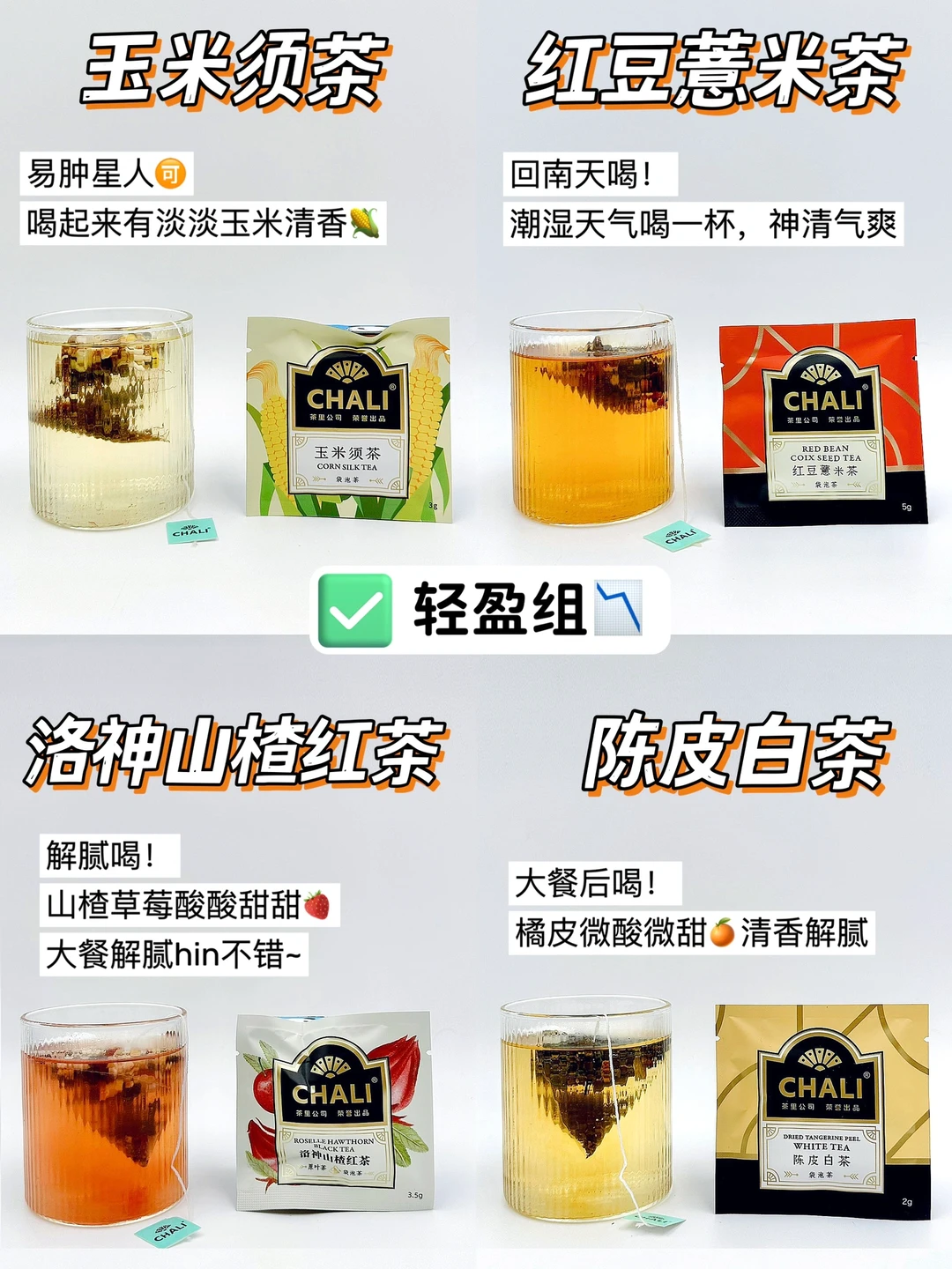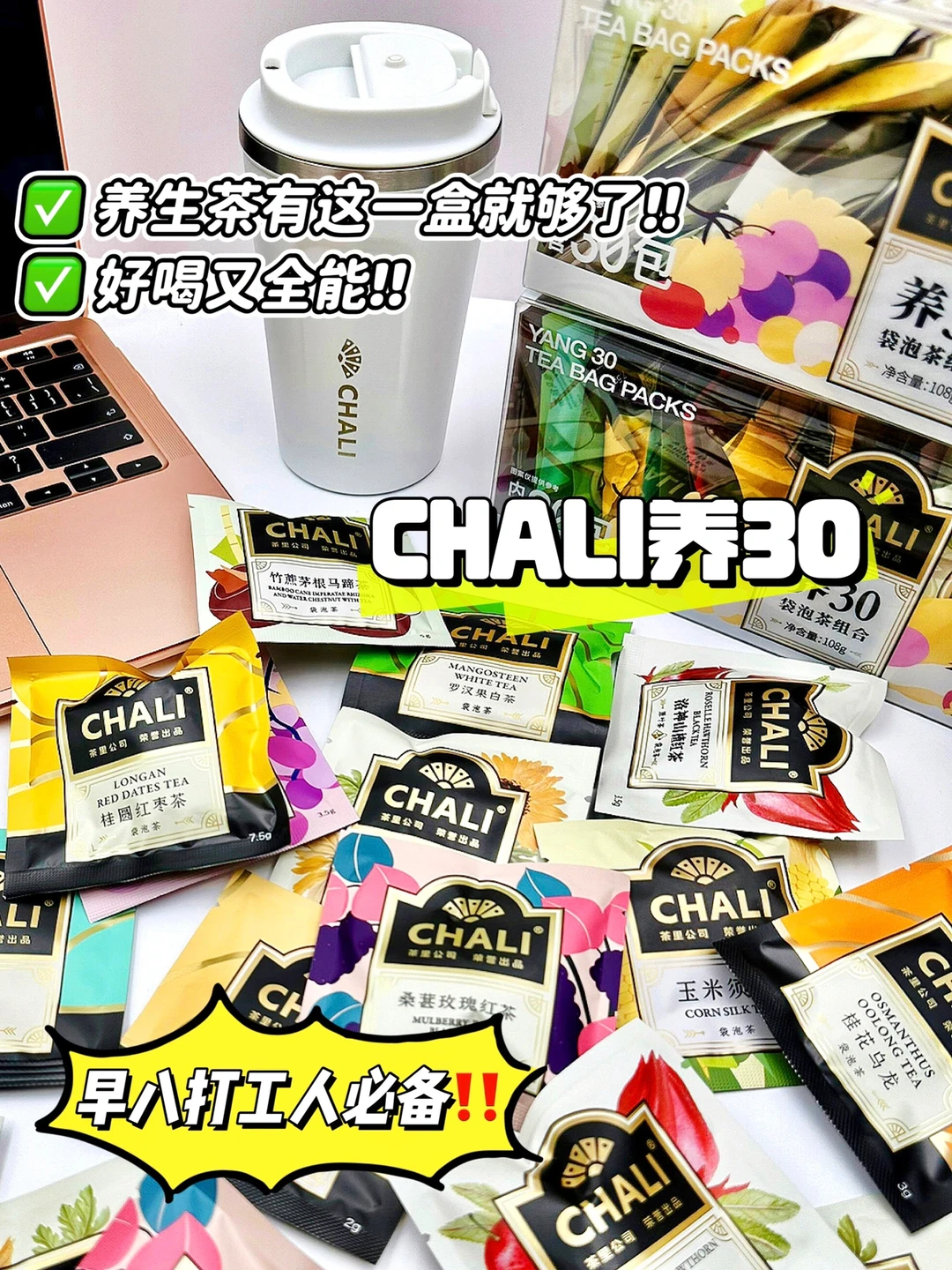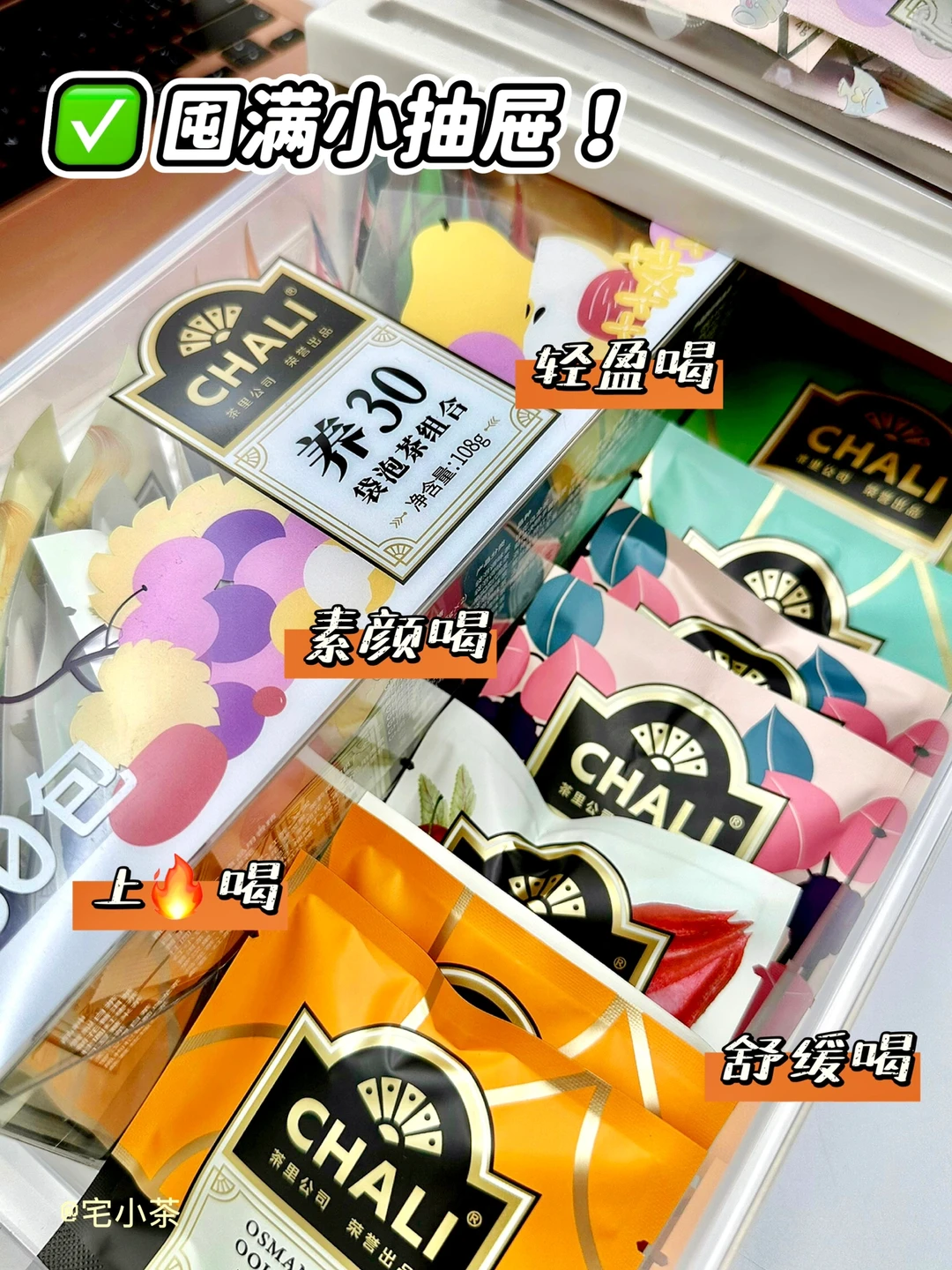有一说一,CHALI养30的茶包真的齐全,满满当当一大盒,口味新鲜全员无糖,减脂人也没有压力~