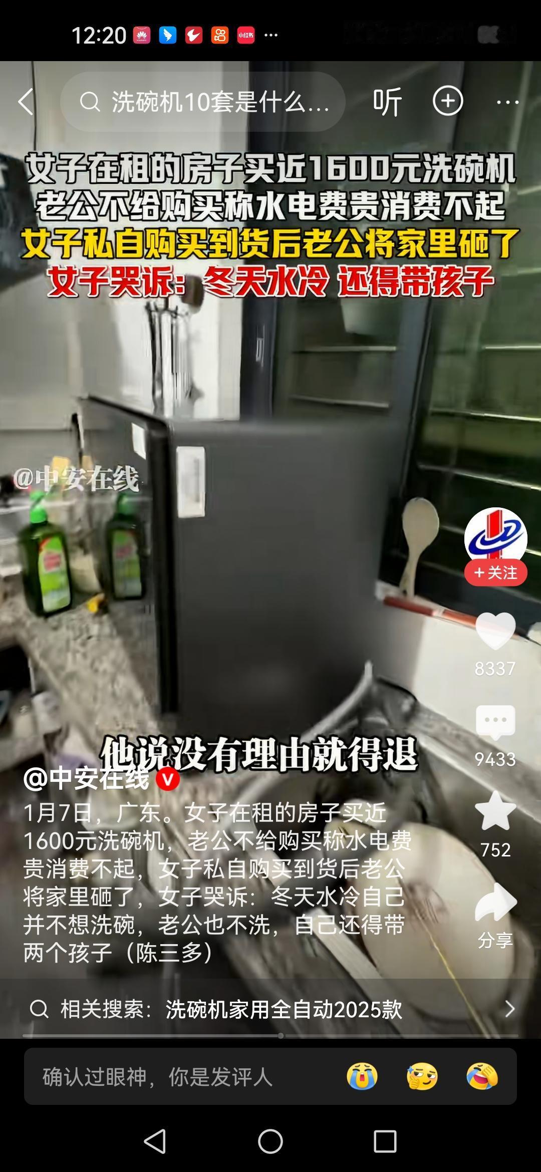 你会因为老婆乱花钱而崩溃把家里乱砸一通吗? 刷到一视频,一女子在广东租来的房子里花了近1600买了一台洗碗机,因为冬天冷还要带娃,她觉得没时间洗碗所以买的。 而他老公在女子买之前明确反对!电费水费都要多花销,另外也许他考虑到这房不是自己的,将来要搬走这东西也不好带走。本着能省就省的原则,反对买,这没有错! 不过女子没听,当老公看到洗碗机到家里的那一刻崩溃了,发泄着把家里乱砸一通。 也许是自己赚钱不容易,感觉女子没有给他保持好家庭,反而乱花钱。其实女人带娃也不容易,老公反对的同时,应该给他一个解决冬天洗碗的方法。比如给安装个热水宝之类的,那个花不了多少钱,一开水龙头就有热水,冬天也不冻手。也比较省水省电。还有最笨的方法就是烧开水,或者热水器用盆子接热水洗。看视频一家三口应该也没有几个碗筷需要洗。花个三五分钟就能解决了。 想省钱又想冬天不洗碗冻手,方法总比困难多。如果是单纯的因为偷懒,不想洗碗,才花的钱买这个洗碗机,老公崩溃也情有可原。 家家有本难念经,应该互相理解和包容。女人心疼男人的赚钱不易,男人心疼女人操持家务带娃的辛苦。多为彼此着想,家庭才会更和谐美好。