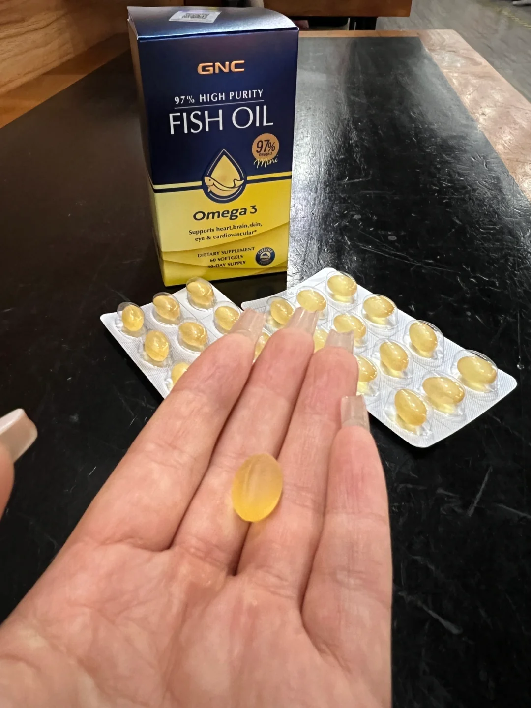 我朋友日常吃的是WHC鱼油,纯度达95%,淡淡的水果味接受度也👌,日常吃没啥问题;我训练多一些,就选了GNC97鱼油,它每两粒富含1230mg的Omega3,纯度达97%