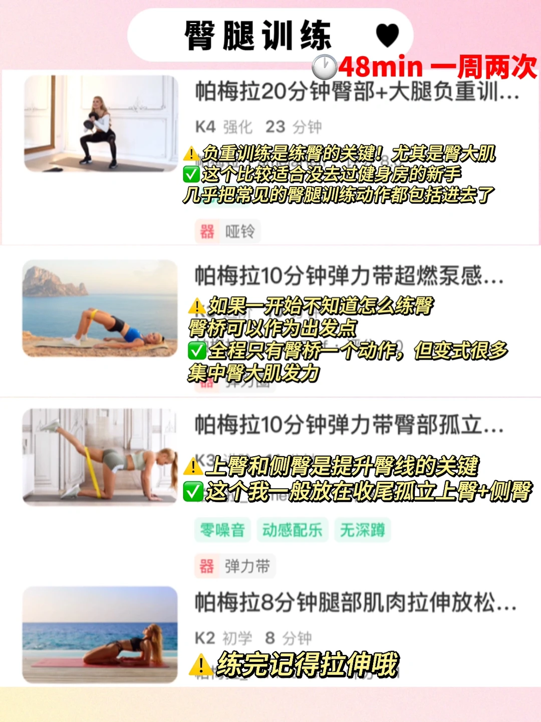 ✨臀腿:热身-正式训练-拉伸,正式训练安排:2个臀大肌复合类+1-2个上臀/下臀+1个侧臀