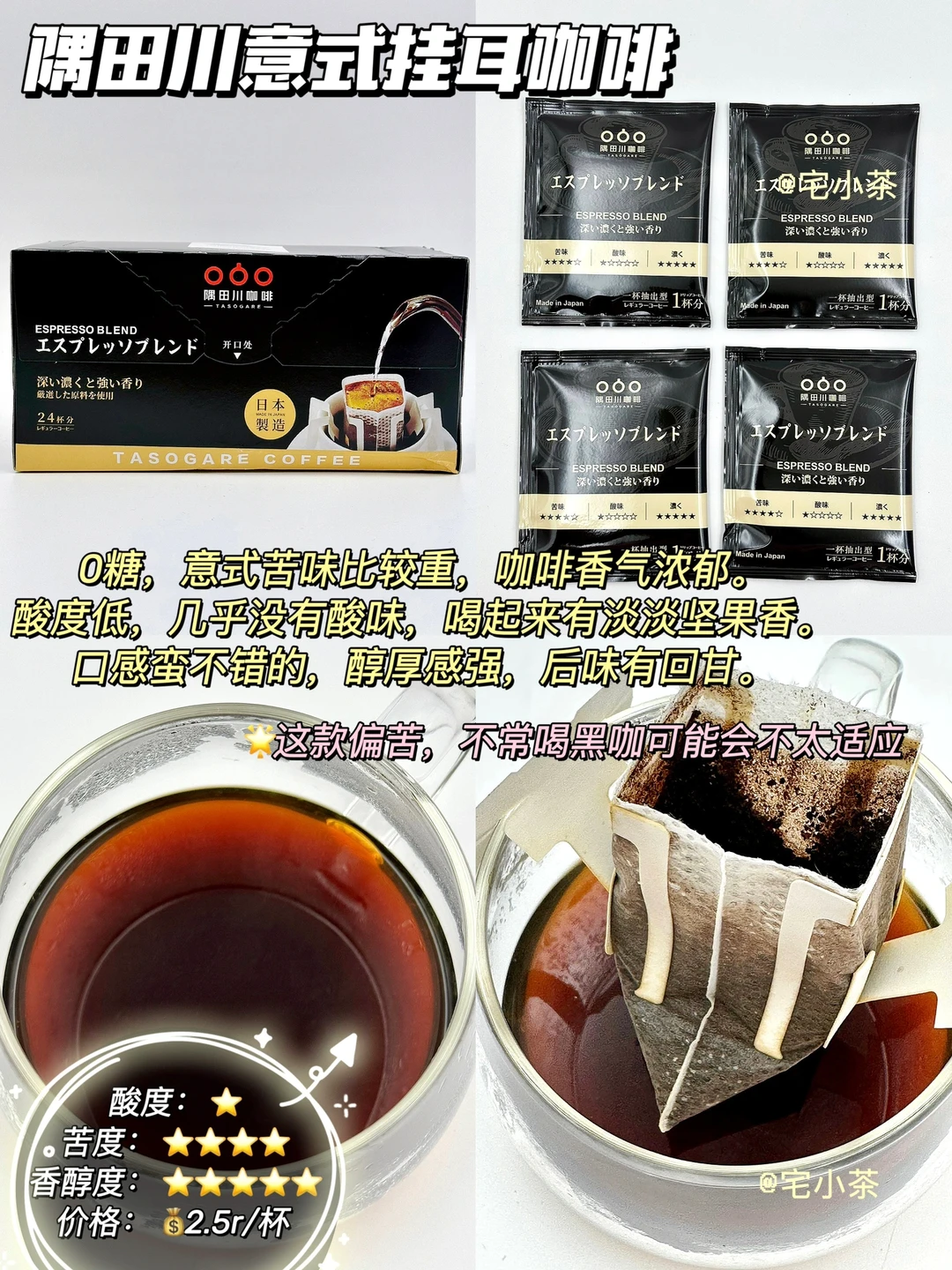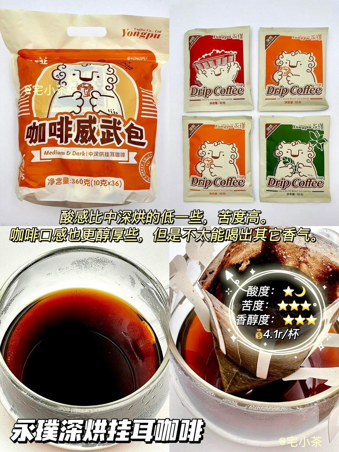 深度烘焙,咖啡香醇不酸涩。苦度适中,不常喝黑咖也能接受🉑