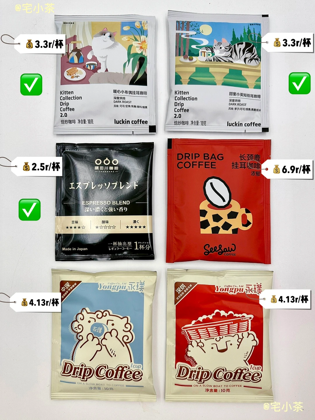 ✔️价格:瑞幸猫咪挂耳(3r)、隅田川挂耳(2.5r)比较实惠