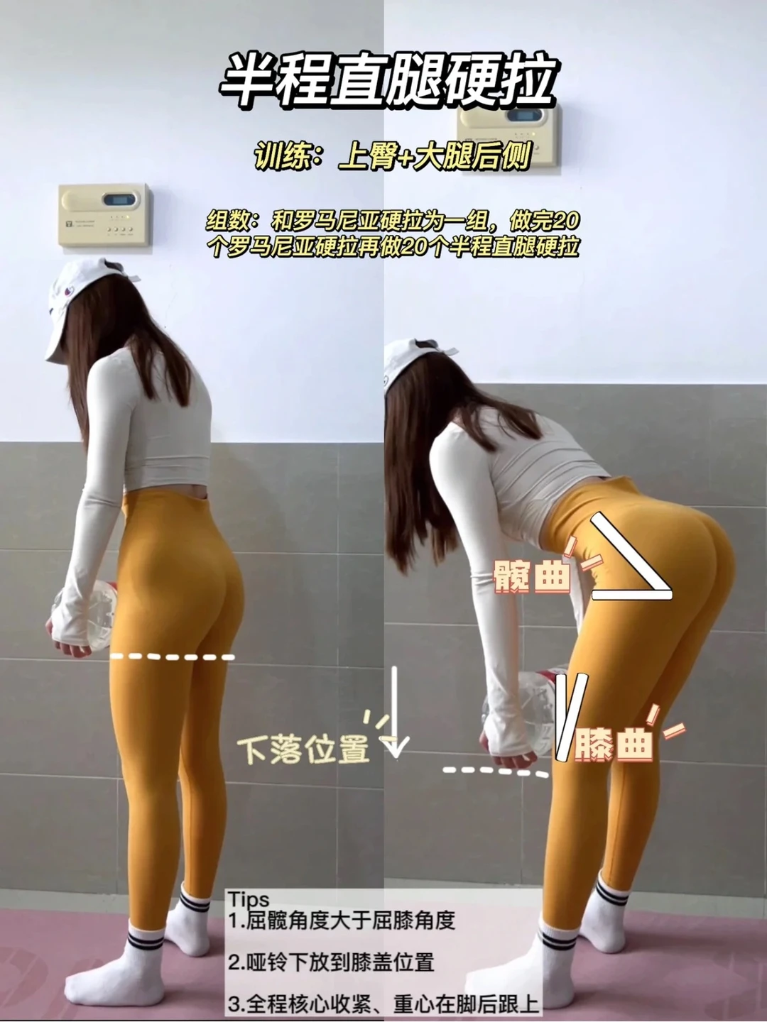 罗马尼亚硬拉和半程直腿硬拉不同在于:前者屈膝多一点所以下臀会练到多一点,后者屈膝少一点所以上臀会练到多一点,而两者的结合刚好把整个臀肌都练到了