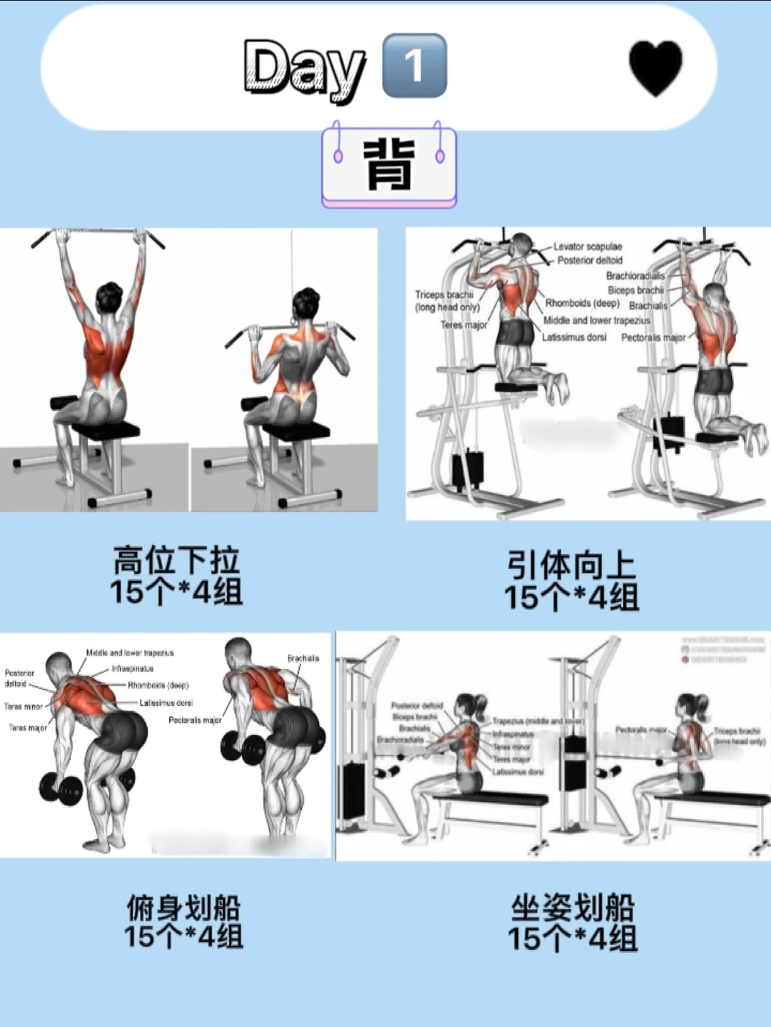 ✅下拉类动作(宽距高位下拉,窄距高位下拉,v把高位下拉)-主要是练背阔和大圆肌(让背更宽也可以👋背部赘肉)