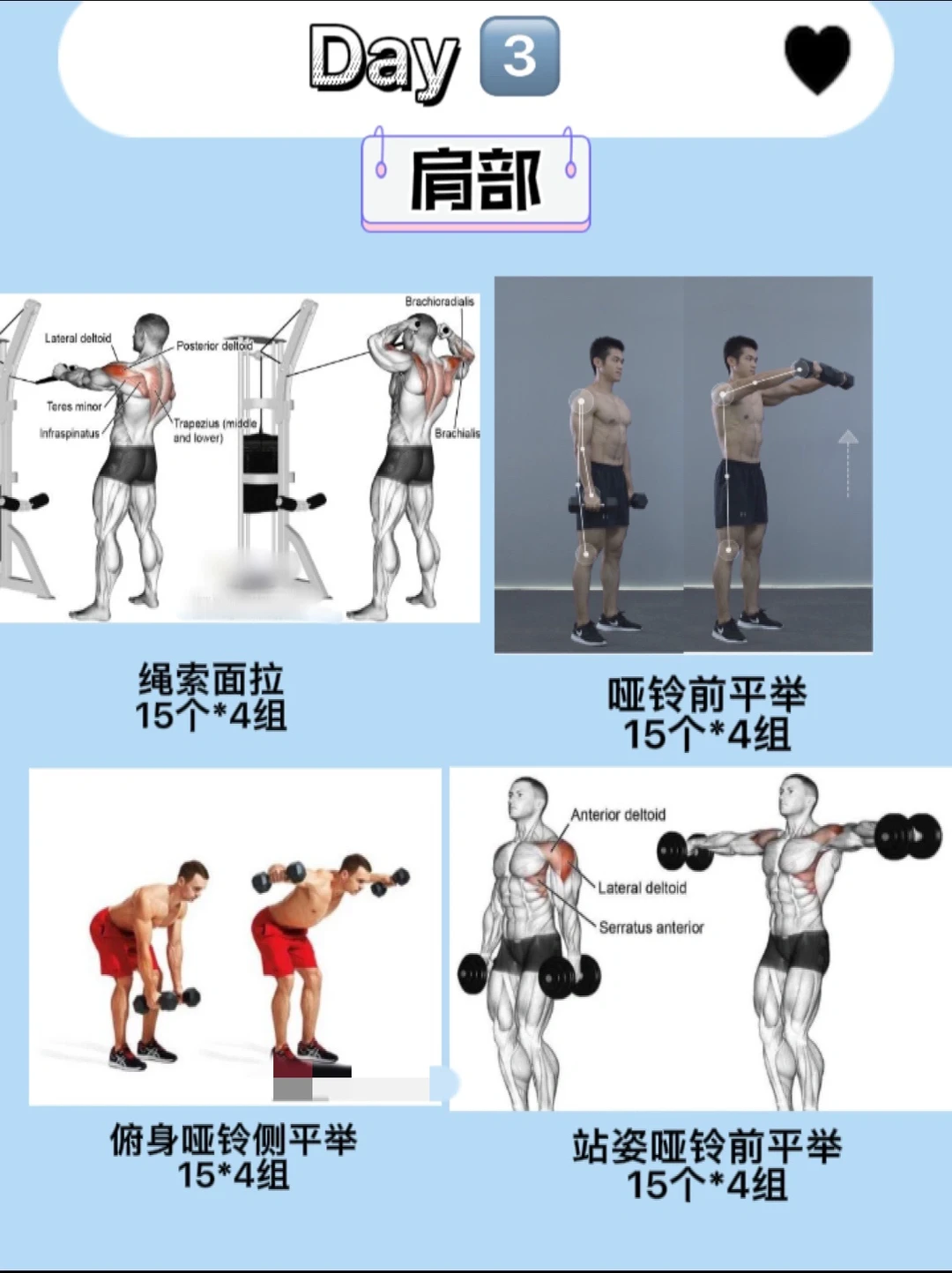 ‼️而肩前束和划船类动作我们每次训练选择1-2个即可,低重量去练就行,不需要上过大负重