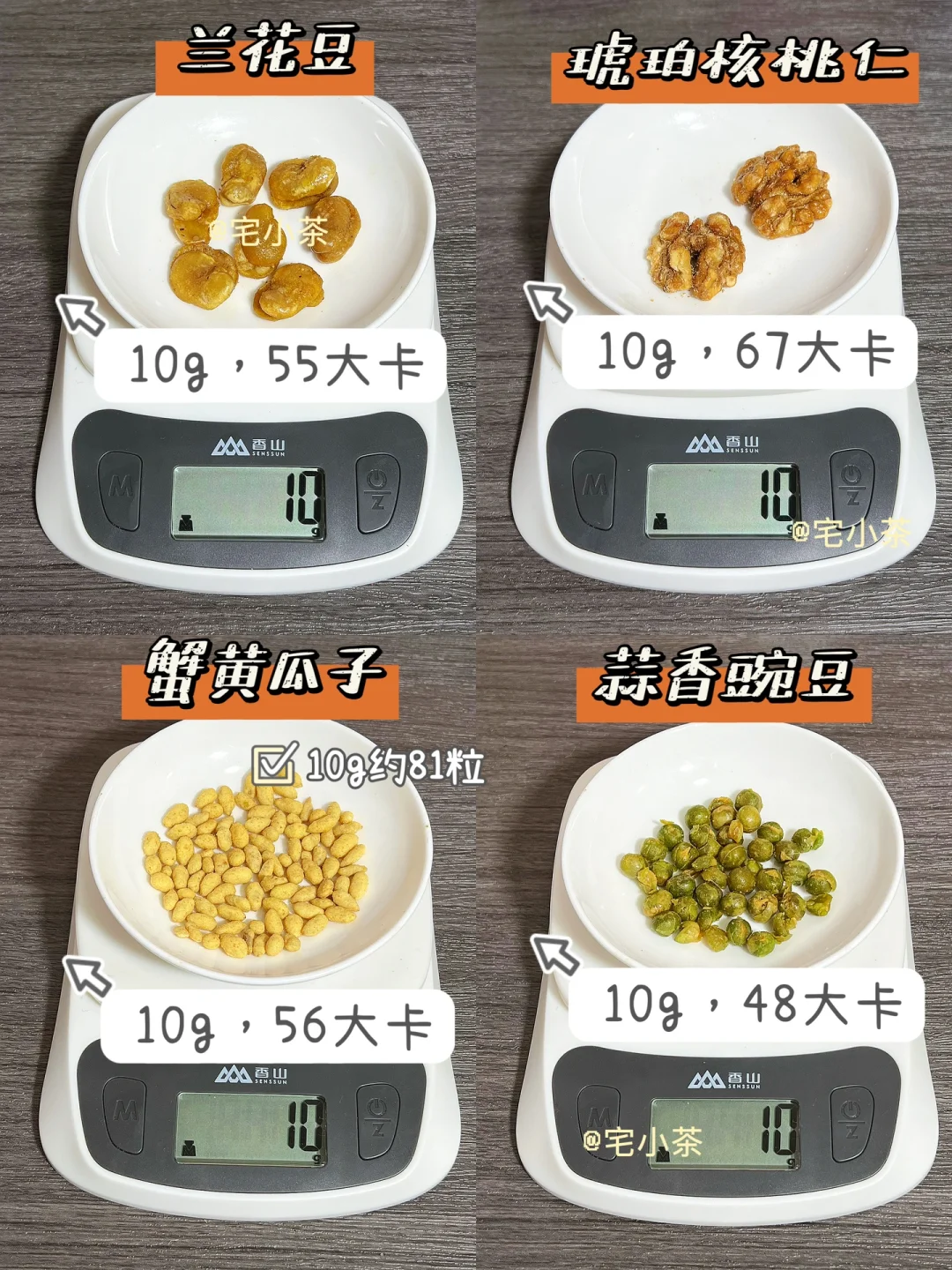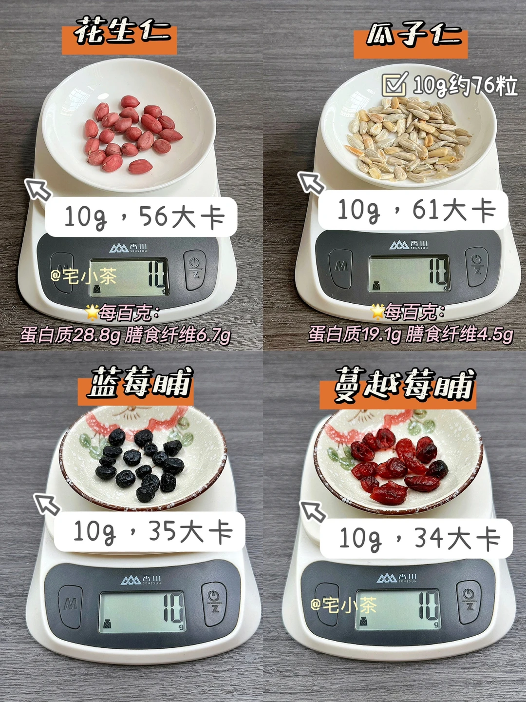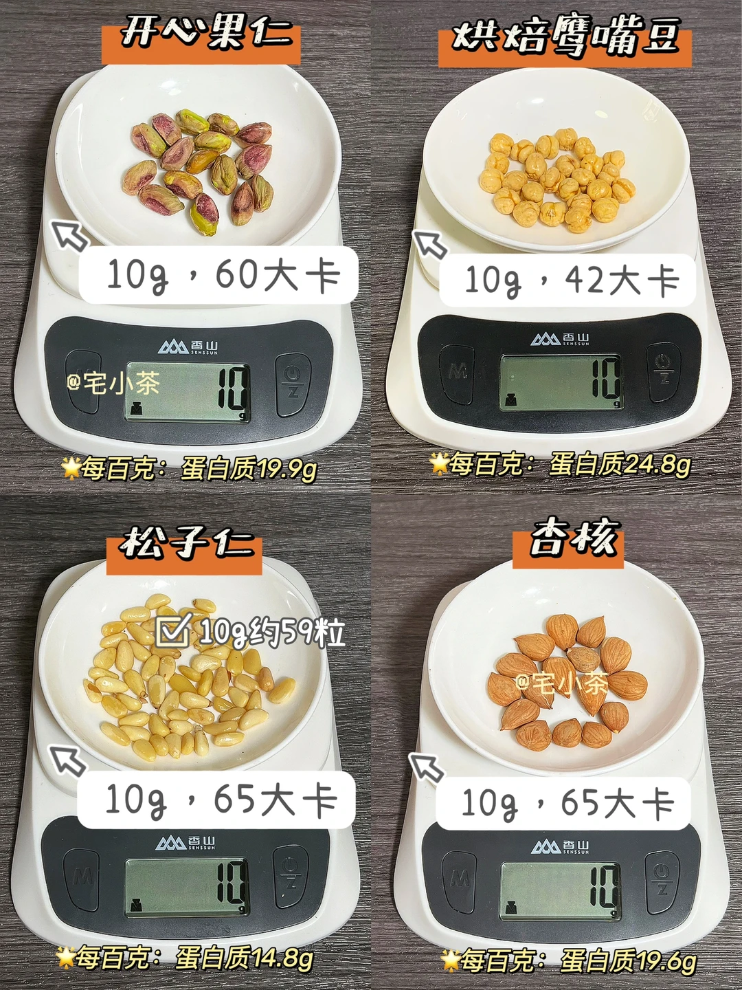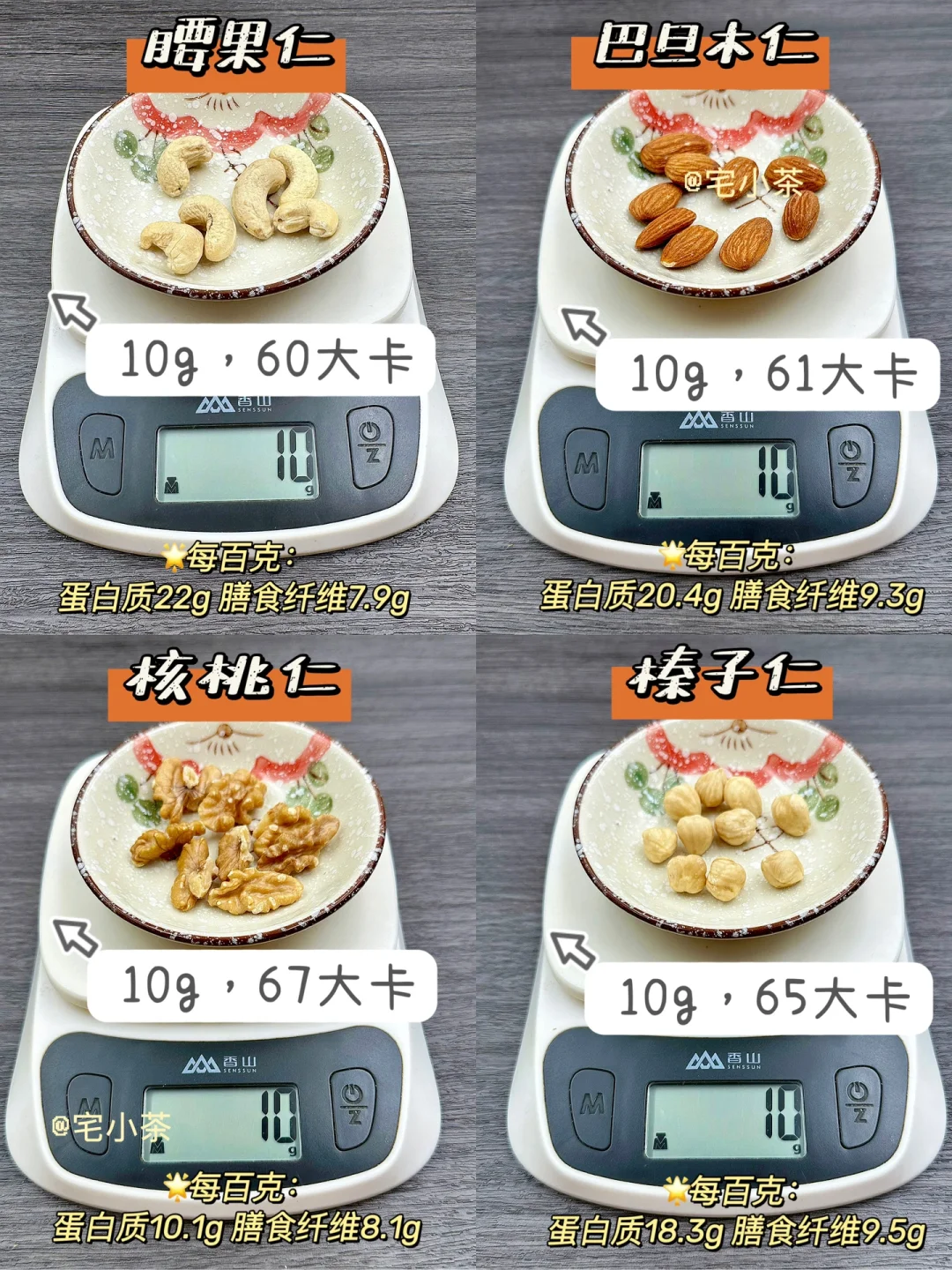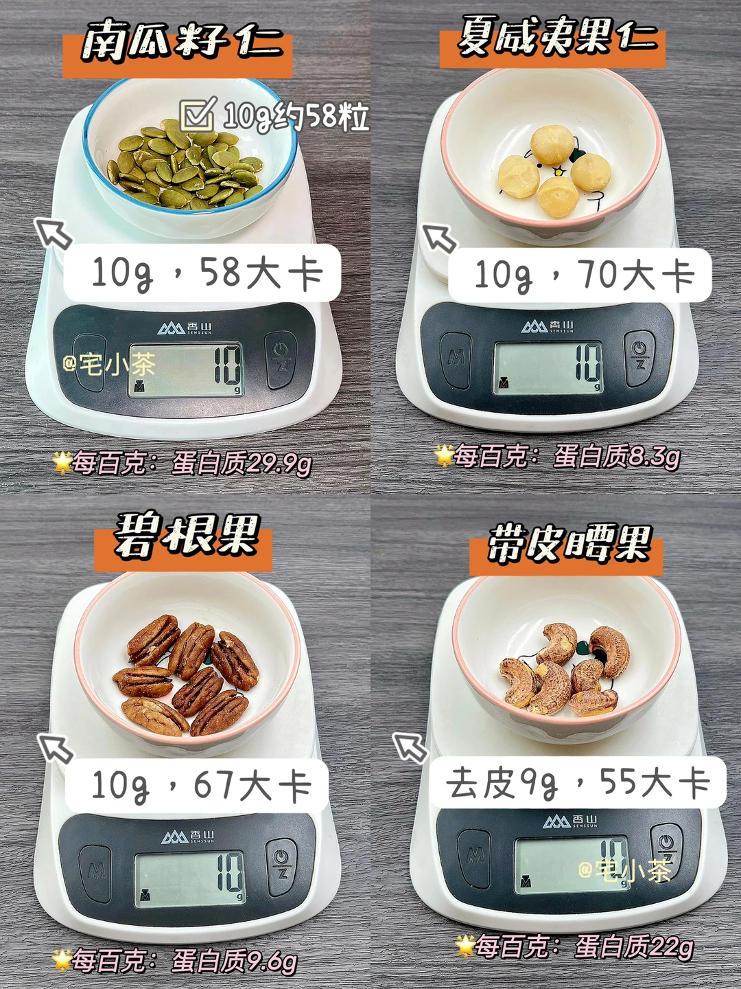 坚果虽然热量不低,但是大多是高蛋白质+优质脂肪,一天内10g~30g都是ok的,可以按喜好自由选择。