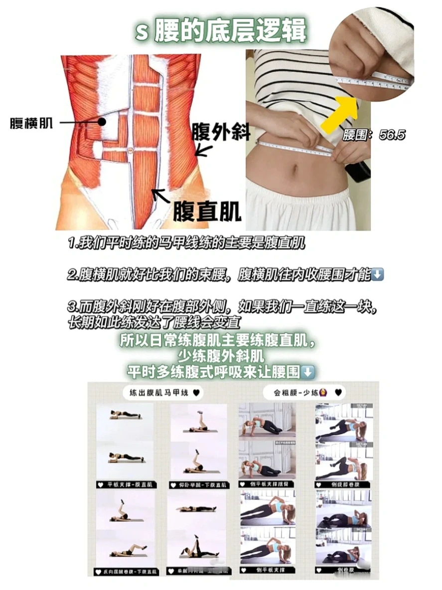 🔹除此以外日常也会去练腹横肌(只有腹横肌往内收腰围才能减小),腹式呼吸是日常只要想起来就会做。