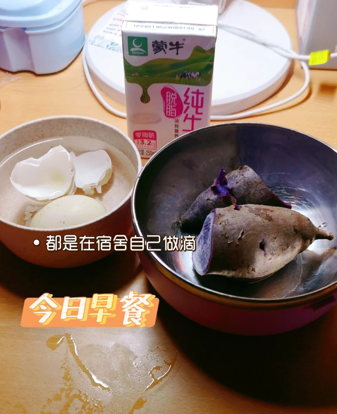 早餐:两个白煮蛋+一个煮紫薯+一杯牛奶