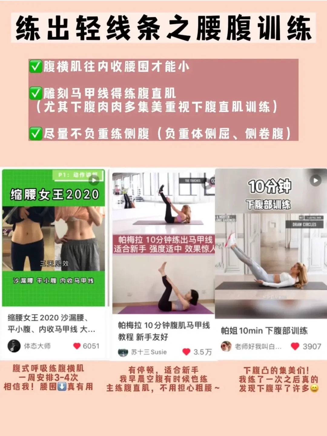 ✅练腹直肌雕刻腹部线条-如平板撑、仰卧举腿等,一周安排2次左右腹肌训练;侧腹训练1-2个动作带一带就好~无需额外安排侧腹训练