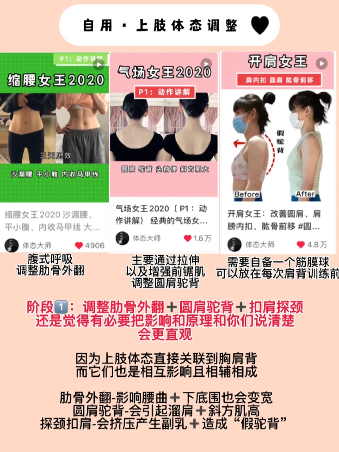 ⚠️好比肋骨外翻,腰会显得H;驼背或肱骨前移,含胸和肩内扣等体态问题也会随之出现(图3是我整理有关上肢体态亲测有用的跟练,每周安排3-4次,可放在无氧运动前)