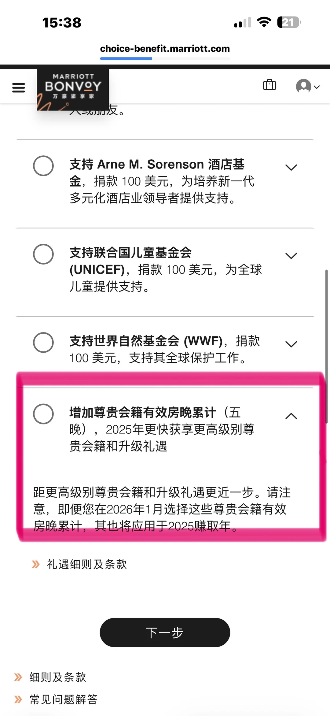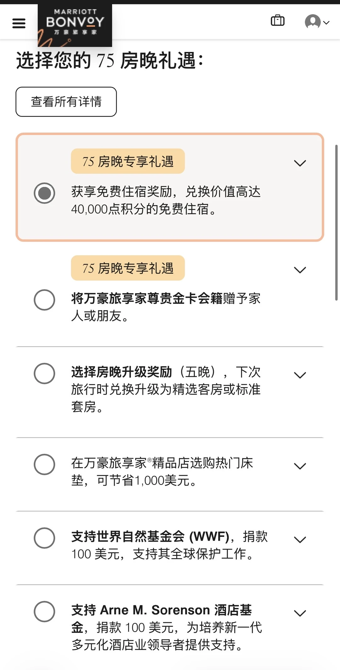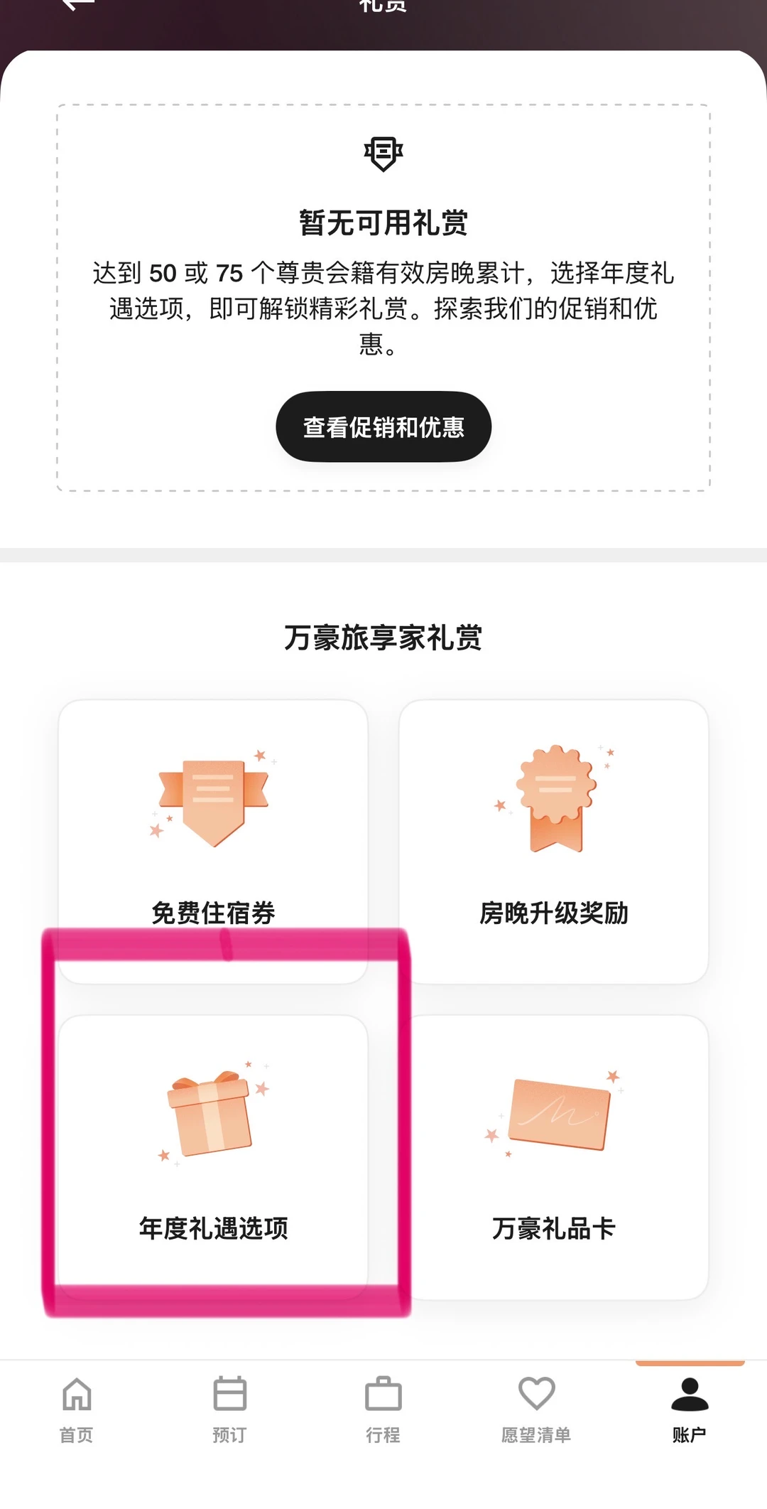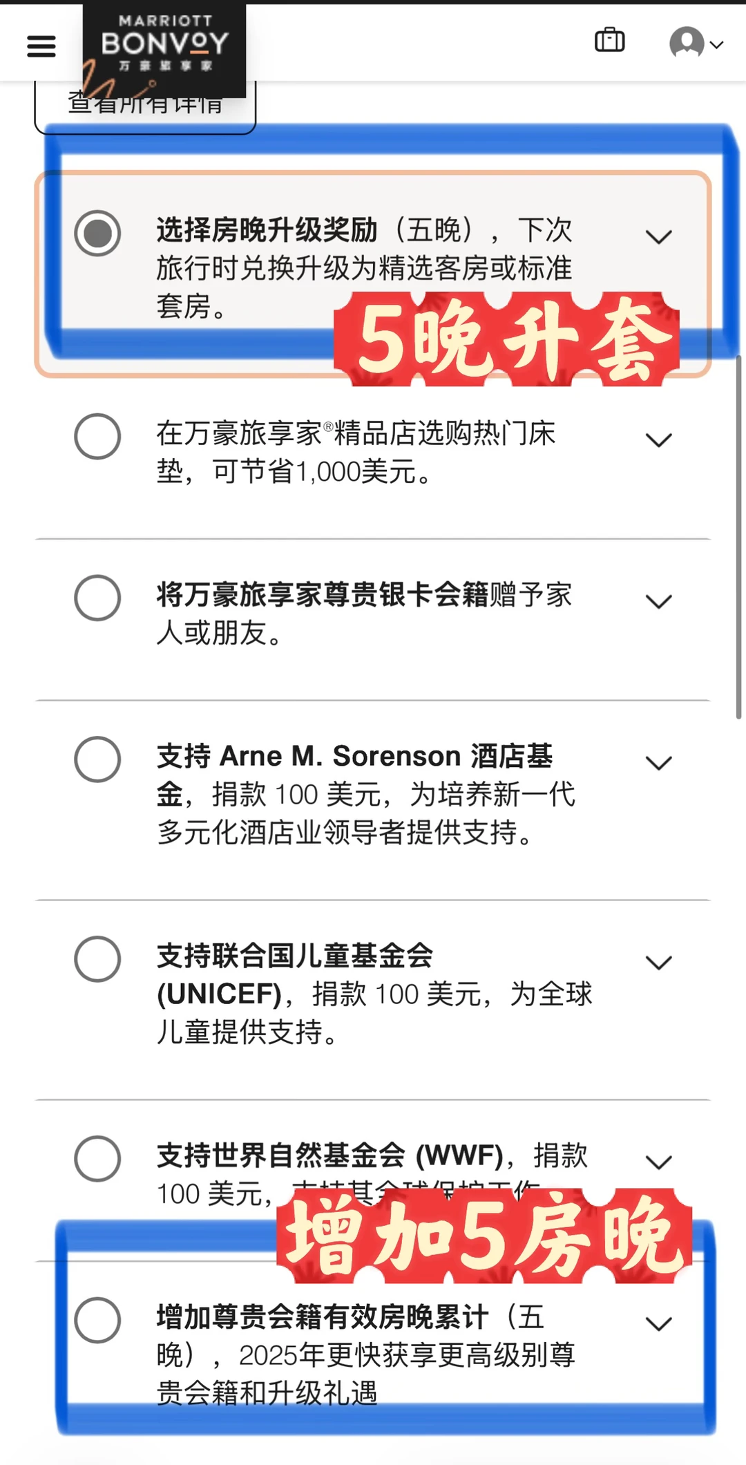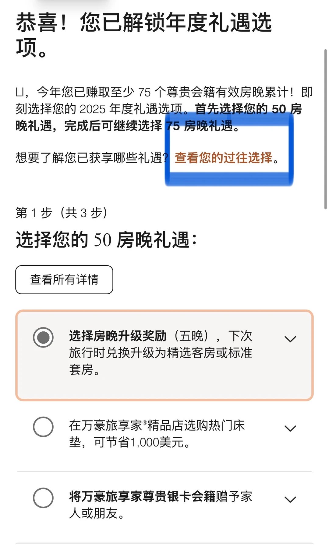 2025奋斗一年,白金或者钛金都达标了吗? ——————————— 首先找到入口挺费劲: 第[一R]步:app,用户,“礼赏”(图2) 第[二R]步:“年度礼遇选项”(图3) 第[三R]步:不知道为啥,还要重新进官网,再登陆一遍(我每次都是这样😹) ㊙️年度礼遇50晚和75晚详解如下: 🔸50晚礼遇(图4) 📌7选1 📌 50晚礼遇,选5晚升套,或保级5个房晚 🔸75晚礼遇(图5) 📌9选1,和50晚可重复享受 📌这个闭眼选40000积分兑房晚 🔸可以看到往年的选项(图6) ——————————— ⛔️避坑项 【关于5晚升套】 🔸入住前App右上角的小铃铛🔔,点进去有提示,但是很多订单无法使用(图7); 🔸不够人性化的是,即使是符合升套标准的订单,每次都是入住前1-2天才能确认是否升套成功; 🔸在国内使用,其实对白金来说特别鸡肋。能升级的不用套房券,入住之前好好聊天都能升套;反之,你用套房券也无法成功升级; 🔸当然如果出国旅行,能用升套券的订单还是蛮方便的。毕竟我总感觉在国外谈心升套房,别人看中国人咋都这样… 【关于增加5房晚】 🔸如图8,点开还有一排小字,如果是现在(2026年1月)选这一项,还是会加到2025年[笑哭了R] 【关于40000分兑换】 🔸40000分的房晚在大陆还是比较少的,奢华品牌也只有栗子可能会有这么多; 🔸国外例如JW,W,瑞吉这些一般40000也不够; 🔸不过可以自己再用15000积分加进去,所以兑换到40000-55000这个区间的,就不亏了! ⚠️最后,2025年选项截止时间是【美国东部时间2月1号】