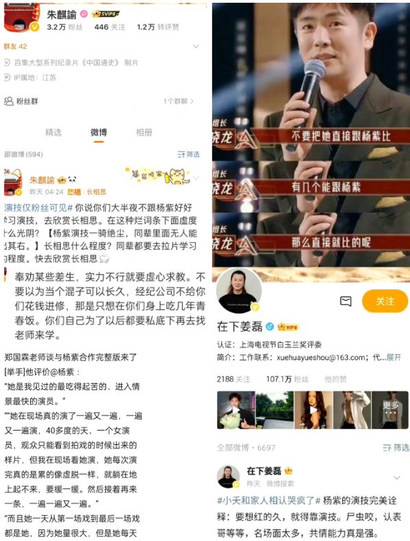 在《长相思》播出期间,一些黑粉发起了关于杨紫演技的热搜,标题为“演技仅粉丝可见”。这一争议在网络上持续发酵,引来了竞争对手粉丝的攻击和谴责。然而,这时,《中国通史》百集制片人朱麒論在社交媒体上发表了一篇博文,他写道:“你说你们大半夜不跟杨紫好好学习演技,去欣赏长相思。在这种烂词条下面虚度什么光阴?【杨紫演技一骑绝尘,同辈里面无人能出其右。】长相思什么程度?同辈都要去拉片学习的程度。”这一言论表明了杨紫在演技方面的出色表现得到了业内人士的高度赞誉。