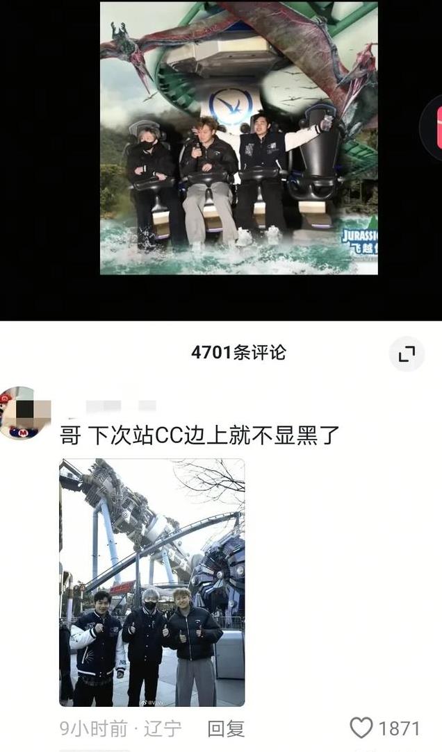 还有网友跟曹巍说:“哥,下次站王cc边上就不显黑了”。这不看到曹巍发的抖音里,玩飞越侏罗纪时,王晨策坐在中局,大头和曹巍坐在两边,是不是王晨策有点害怕。怪不得曹巍在王楚钦的评论区里跟牛冠凯说:“王cc都吓哭了”,坐过山车的时候给吓的哭了。后面看到有网友去问王晨策哭了吗?王晨策说没哭,他是被风迷了眼。