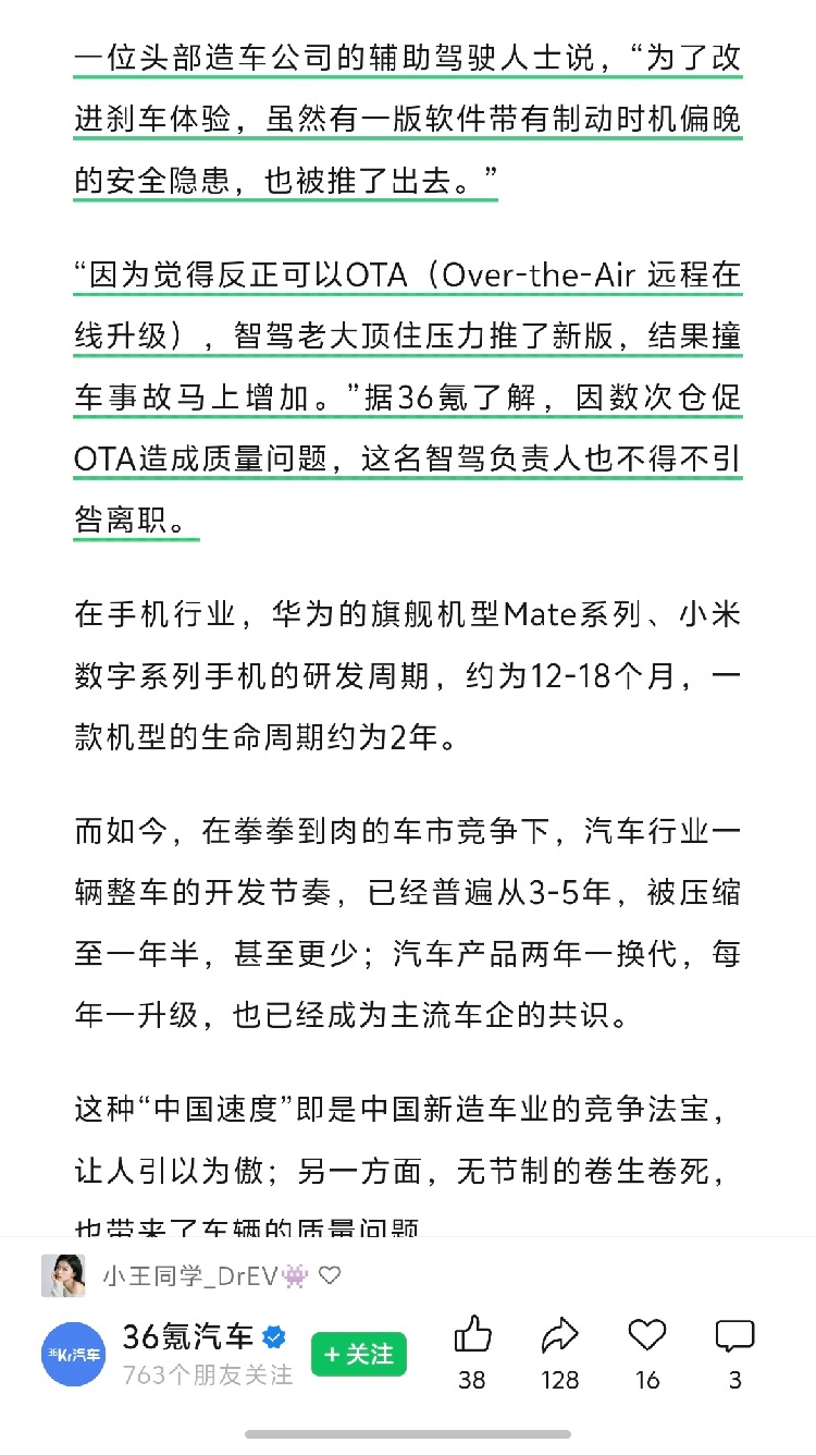 就在昨天,36氪曝光了一个行业内早已心照不宣却始终不愿摆在台面上的“潜规则”:为了赶进度,有头部车企明知软件存在“制动时机偏晚”的刹车隐患,却依然强行推送上市。 理由听起来既荒谬又“合理”——反正有OTA,这次推出去,下次再修回来。