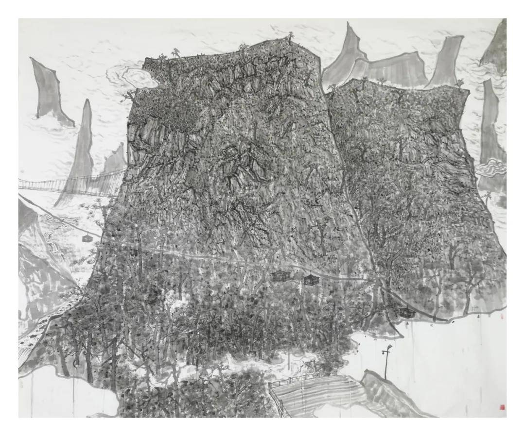 读他的画,总能触摸到灵魂的褶皱——那是对生活美景的深情凝视,更是对自然本真的虔诚追慕。有时,山间密林的生机牵动了他的笔锋:画里大树小树错落交织,枯木的遒劲与荣叶的葱郁形成奇妙对话,笔触虚实晕染出林间的幽寂,万物在灰白调中达成和谐共生。有时,丹霞地貌震撼了他的心魄,层层叠叠的岩壁在墨色渐变中透着岁月的厚重,岩缝中倔强生长的草木更显生命力的坚韧,让人心生“可居可游、可感可触”之情。