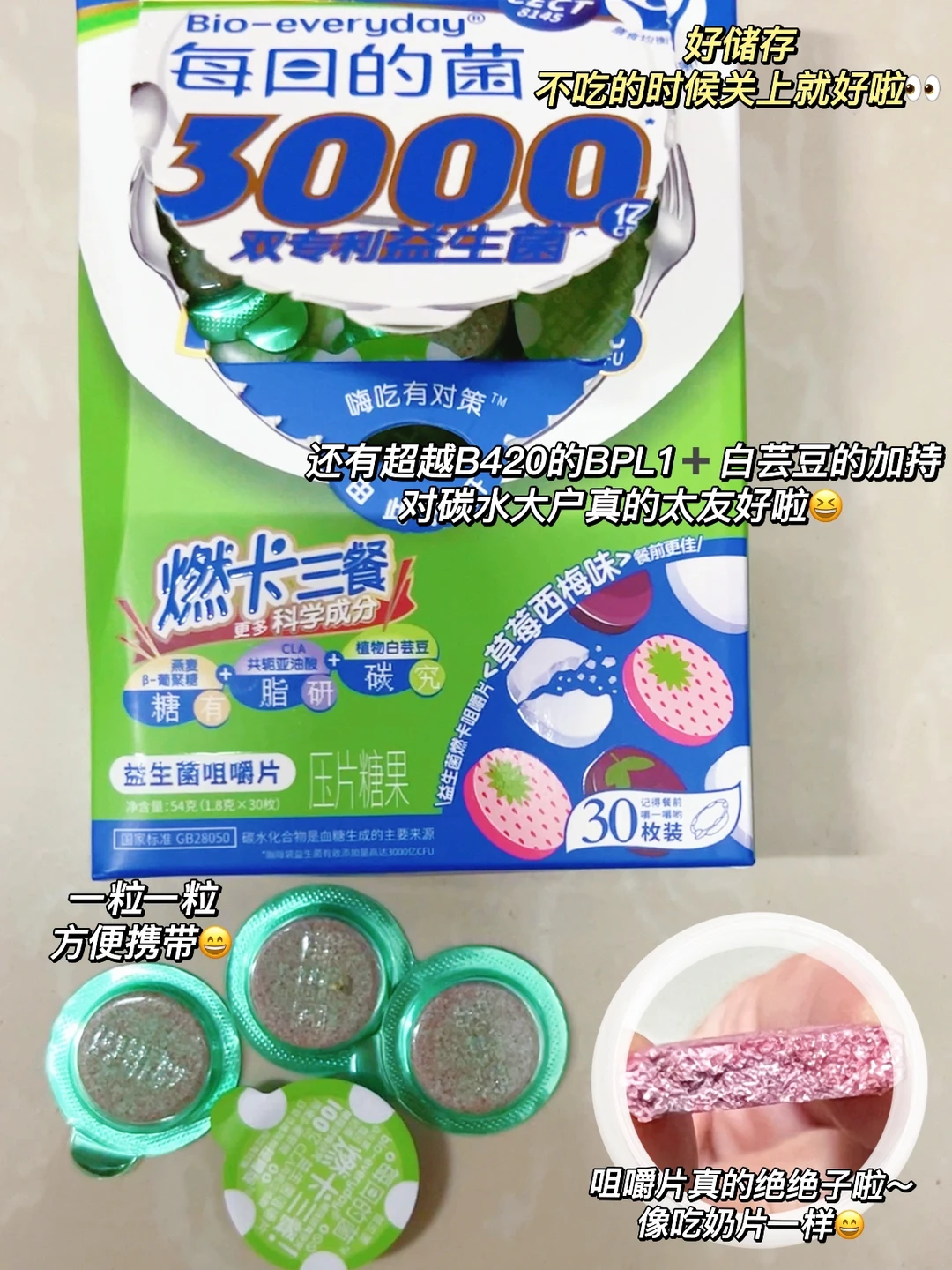 🔹为了保证碳水的摄入,同时又没有心理负担,我自己是一直有补充益生菌的习惯, 一般饭前吃一枚每日的菌燃卡片,它里面有一个菌株是“乳双歧杆菌BPL1”,是超越B420的存在,加上白芸豆提取物,可以说是对碳水大户们很友好了。