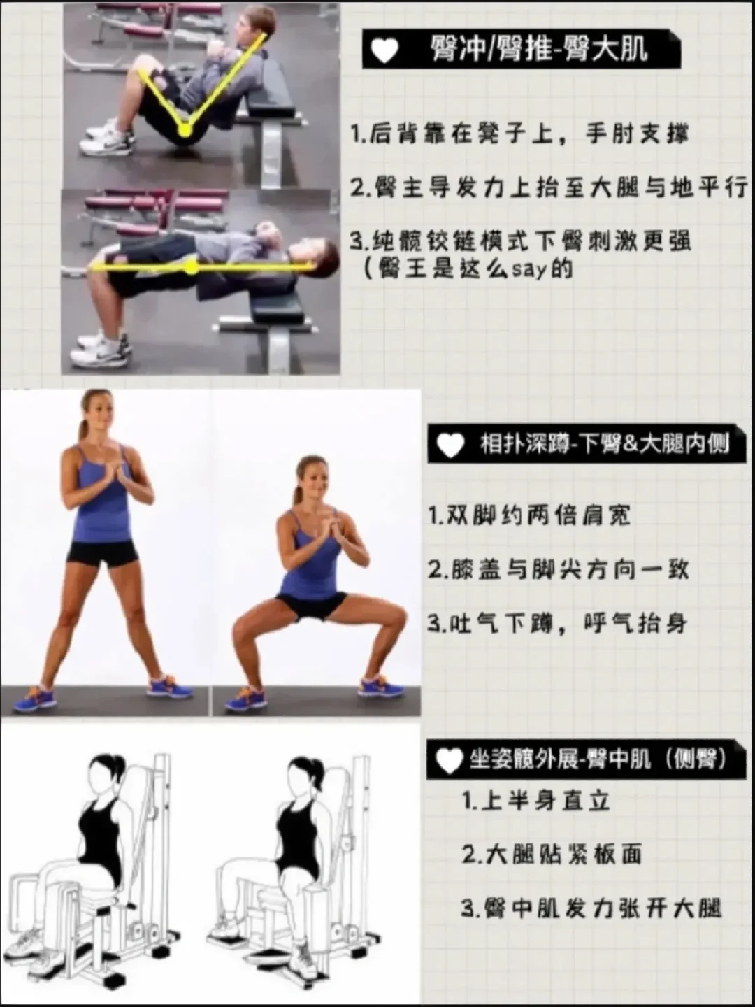 🔹后来我就多关注臀大肌+上臀训练,侧臀不上大重量,而是自负重或者低重量多组数收尾,逐渐臀型也慢慢练圆了~