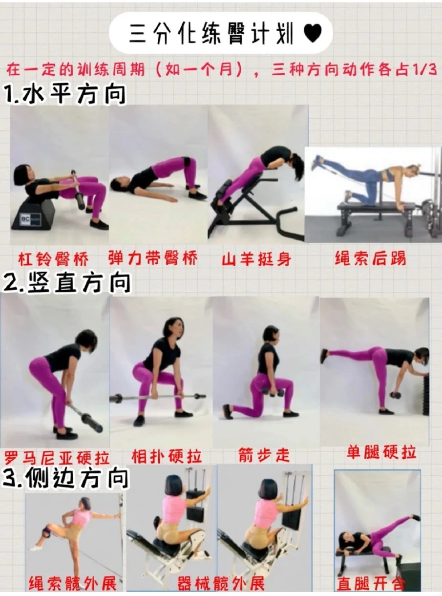 ✅如果一周三练臀,一天大重量(该重量下能做6-8个),一天中等重量(能做9-12个),一天小重量(能做13-20个)