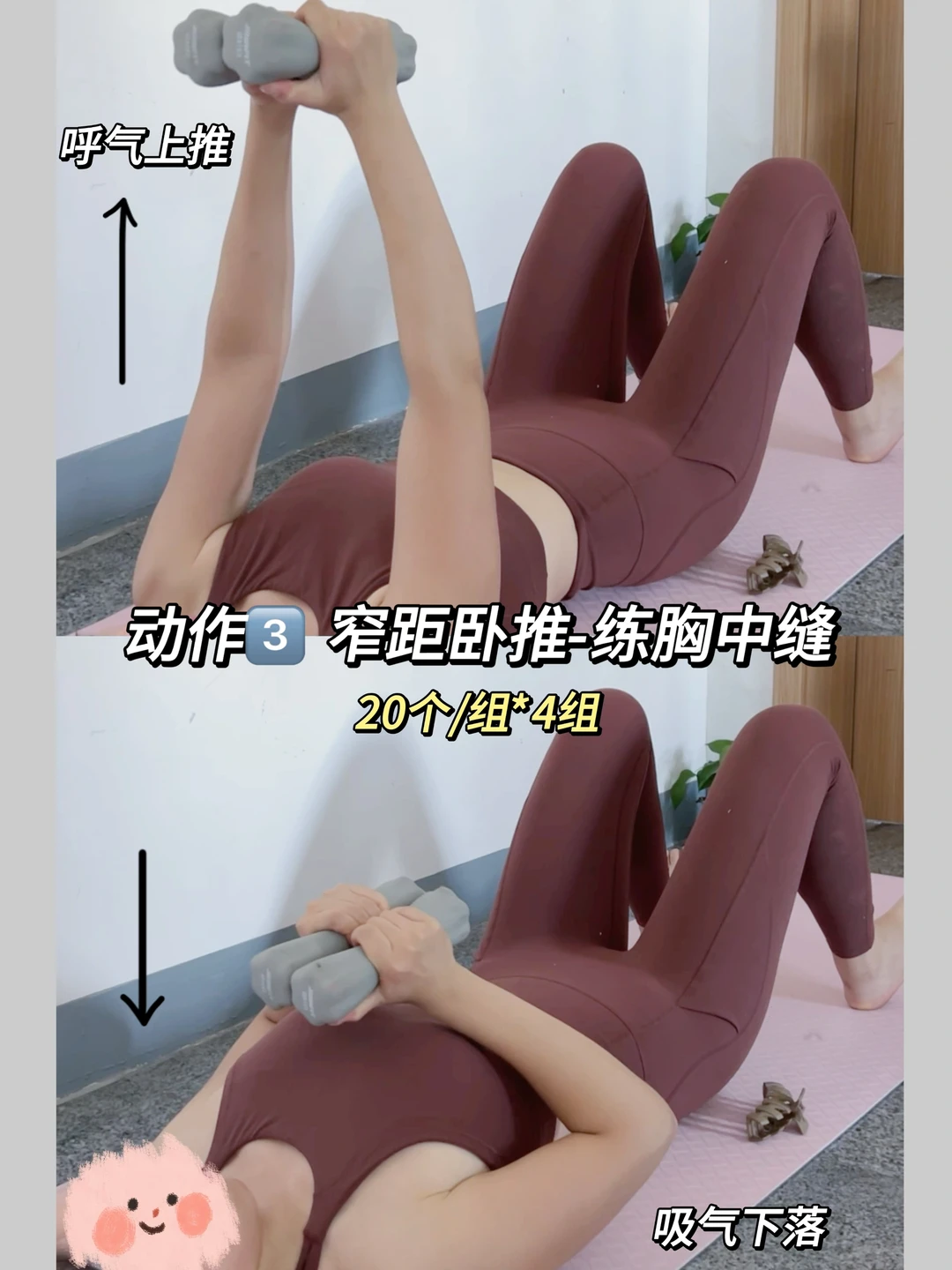 3️⃣窄距卧推-练胸中缝
