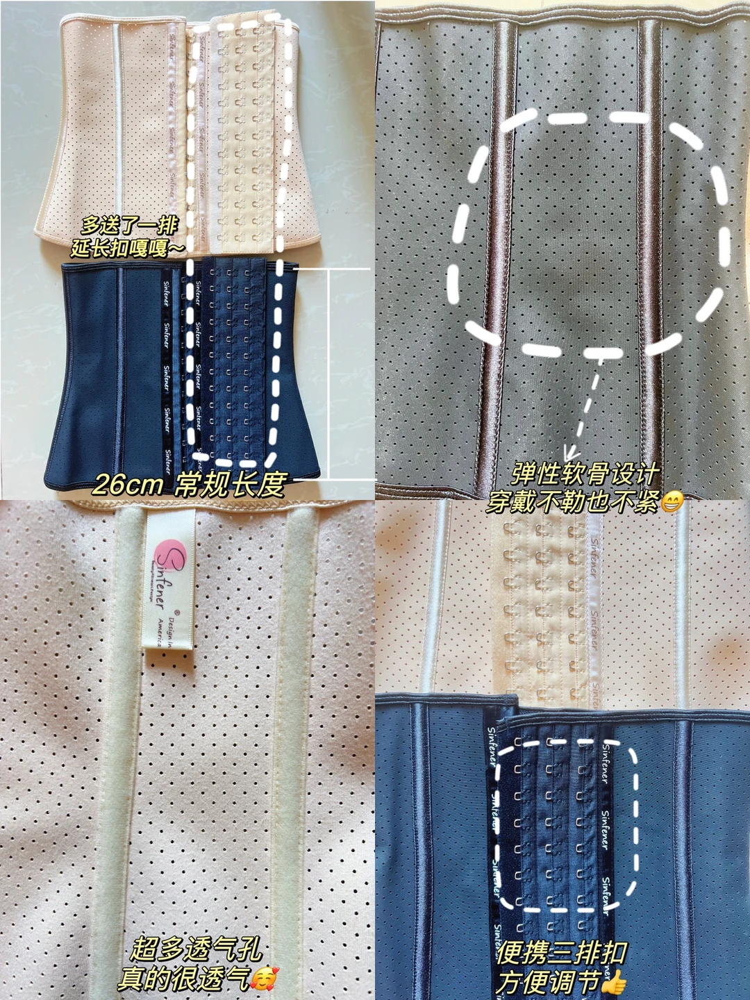它的设计是弹性软骨的所以我做运动的时候也没有感受到拘束,而且长度26cm对我这样的运动女孩来说刚刚好!平常也有佩戴束腰的习惯,但都不会超过3小时,一般出去玩带的会比较多,毕竟想拍照好看嘛嘿嘿~穿在裙子里面看不大出来痕迹,也能自然的修饰腰线就很nice~