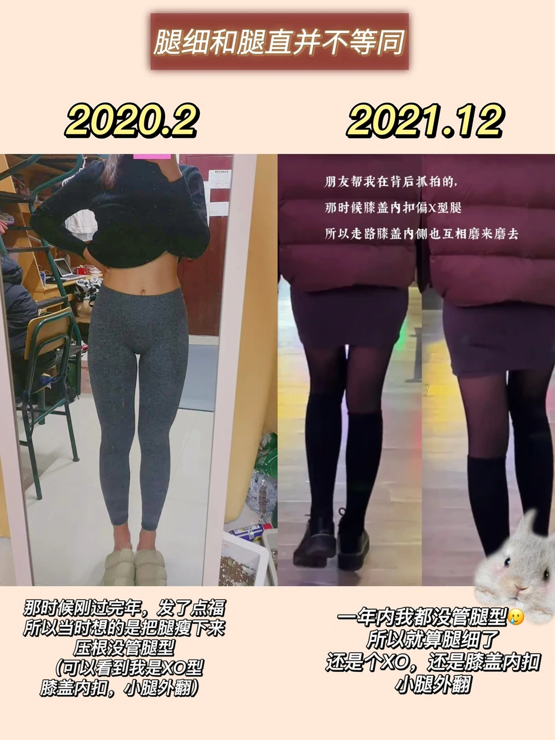 2021.12 和前一年相比确实细了,但是XO腿还是有,走路也会磨膝盖(因为这一年我都没有在乎腿型的体态问题,只是想着瘦)