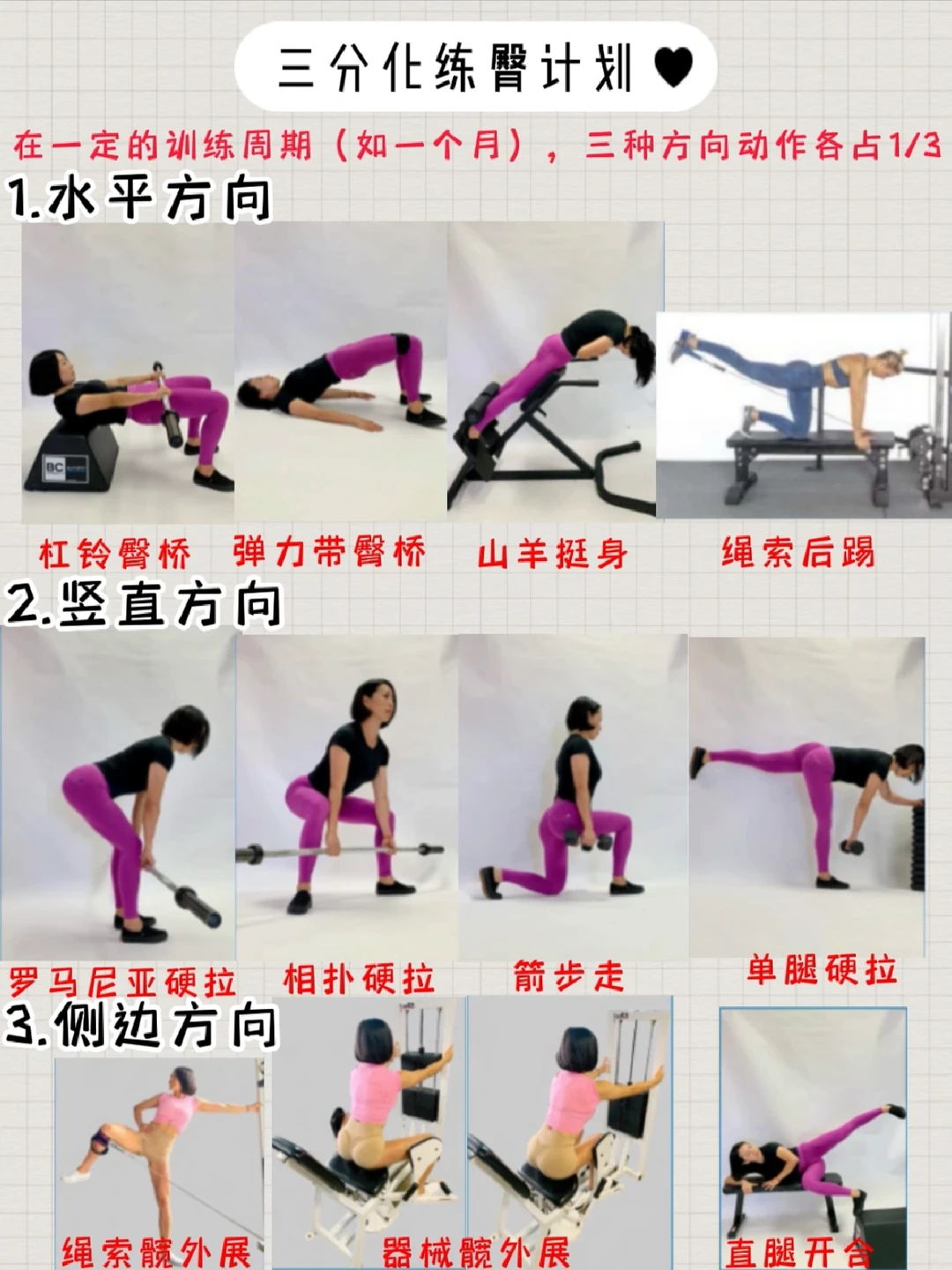🔹健身3年,练臀一直采用三分化练臀计划,即每次练臀水平、竖直、侧向都要兼顾(参考图6-11)