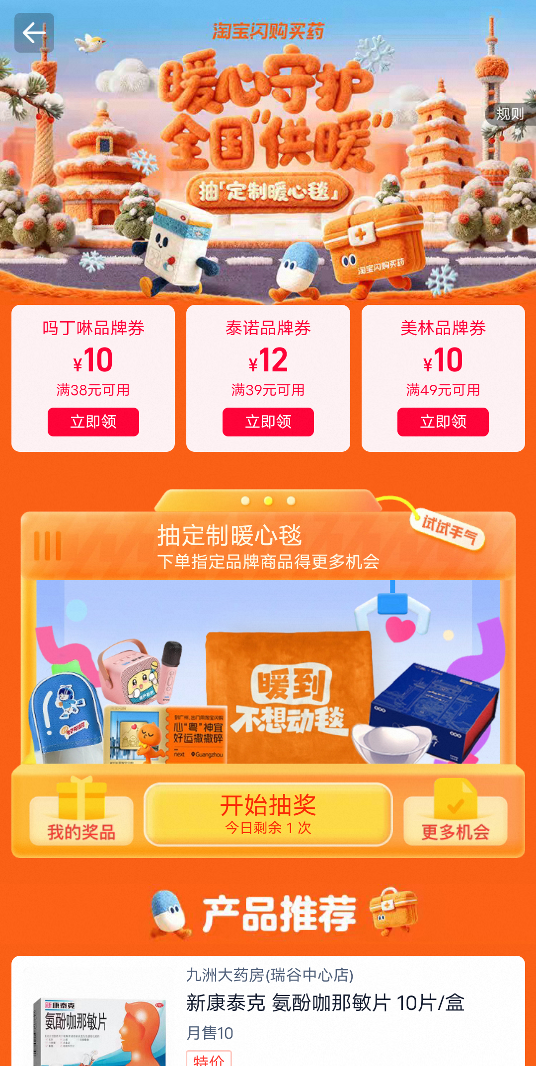 打工人的开年是写完Q4汇报,还有年终汇报白天撑公司,晚上撑家里,就是容易忘了撑自己看到淘宝闪购买药暖心标语——“给0°C里赶路的人,来一个37°C的抱抱”这一刻,真的被暖到无论何时何地,遇上小病小痛,都有淘宝闪购买药温暖每个顶梁柱现在上淘宝闪购搜【闪购买药】,有机会抽暖绒毛毯、痛包等限定周边哦,完成指定任务,更是有机会获得额外抽奖机会!暖的不止有最快19分钟送达的药,更是让我们安心当顶梁柱的每一程!看病买药上淘宝闪购暖心守护全国供暖