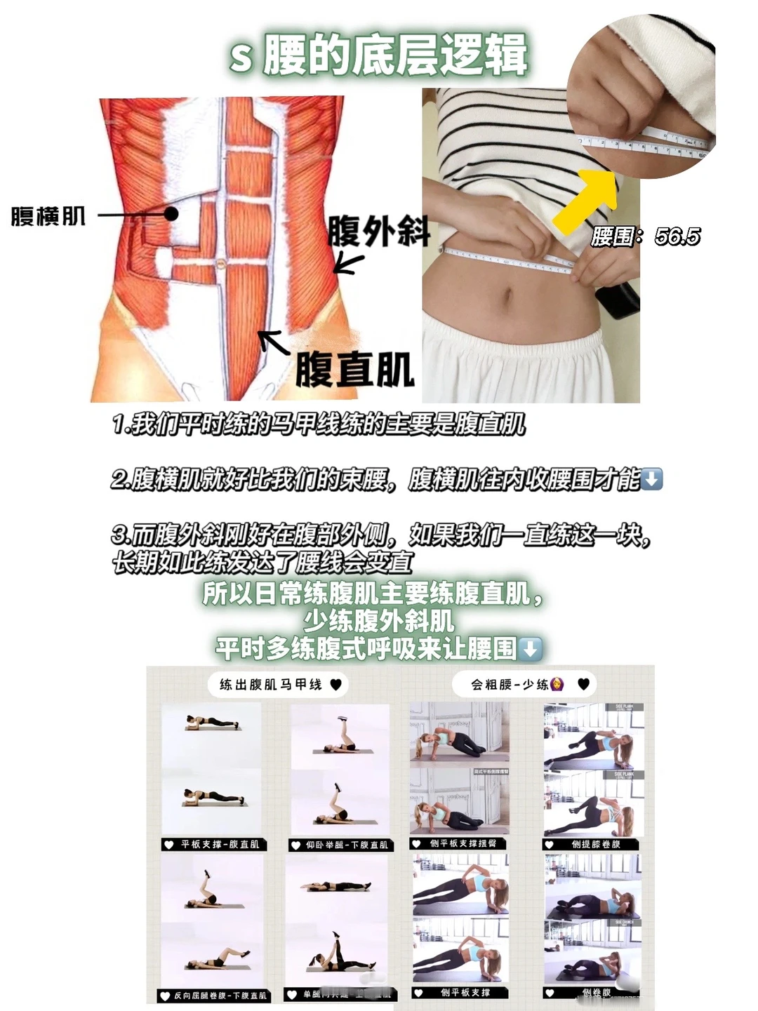 ✅就得多练腹横肌:因为腹横肌好比人体自带的“腰带”,它往内收腰围才能小