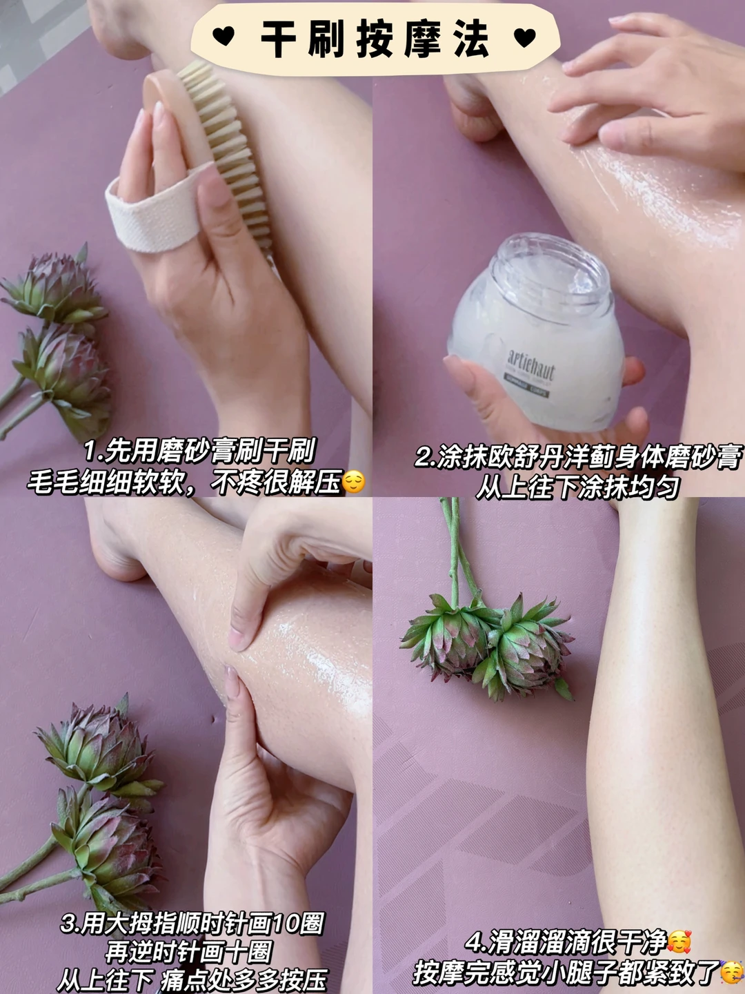 每次洗澡前我先用洋蓟身体磨砂膏均匀涂满腿部,凝露质地配合干刷先磨后洗也不疼,