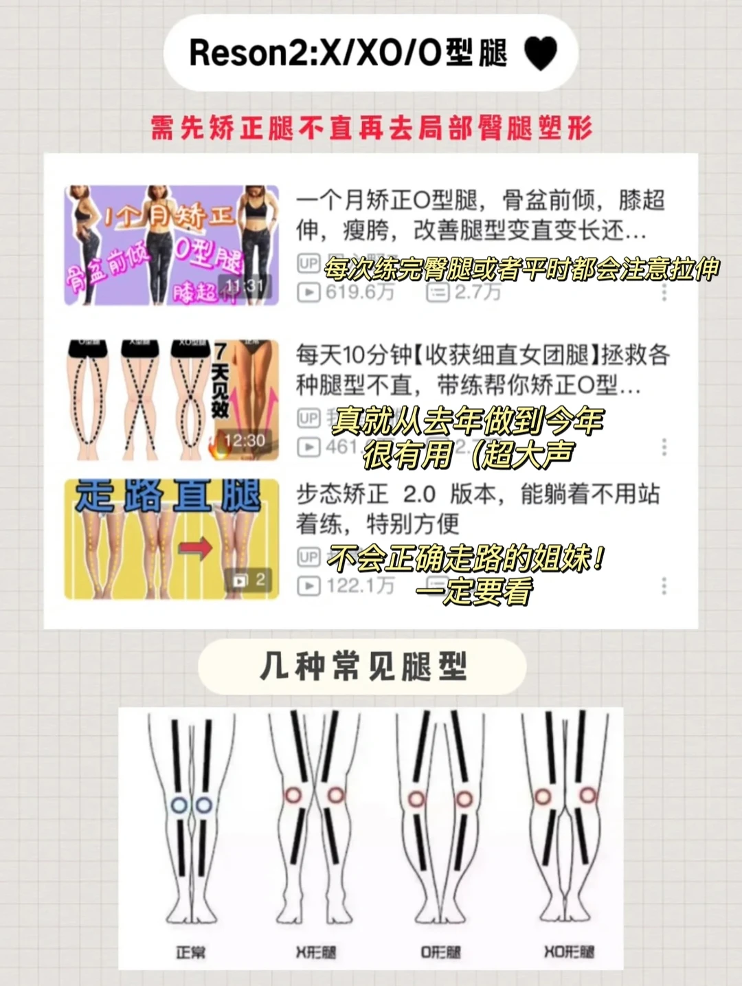 💛X/XO/O型腿(很多腿不直的姐妹走路:膝盖内旋脚踝外旋,小腿肌肉往外翻,长期不正确的走路姿态,就形成了腿型不直,腿子粗的状态)