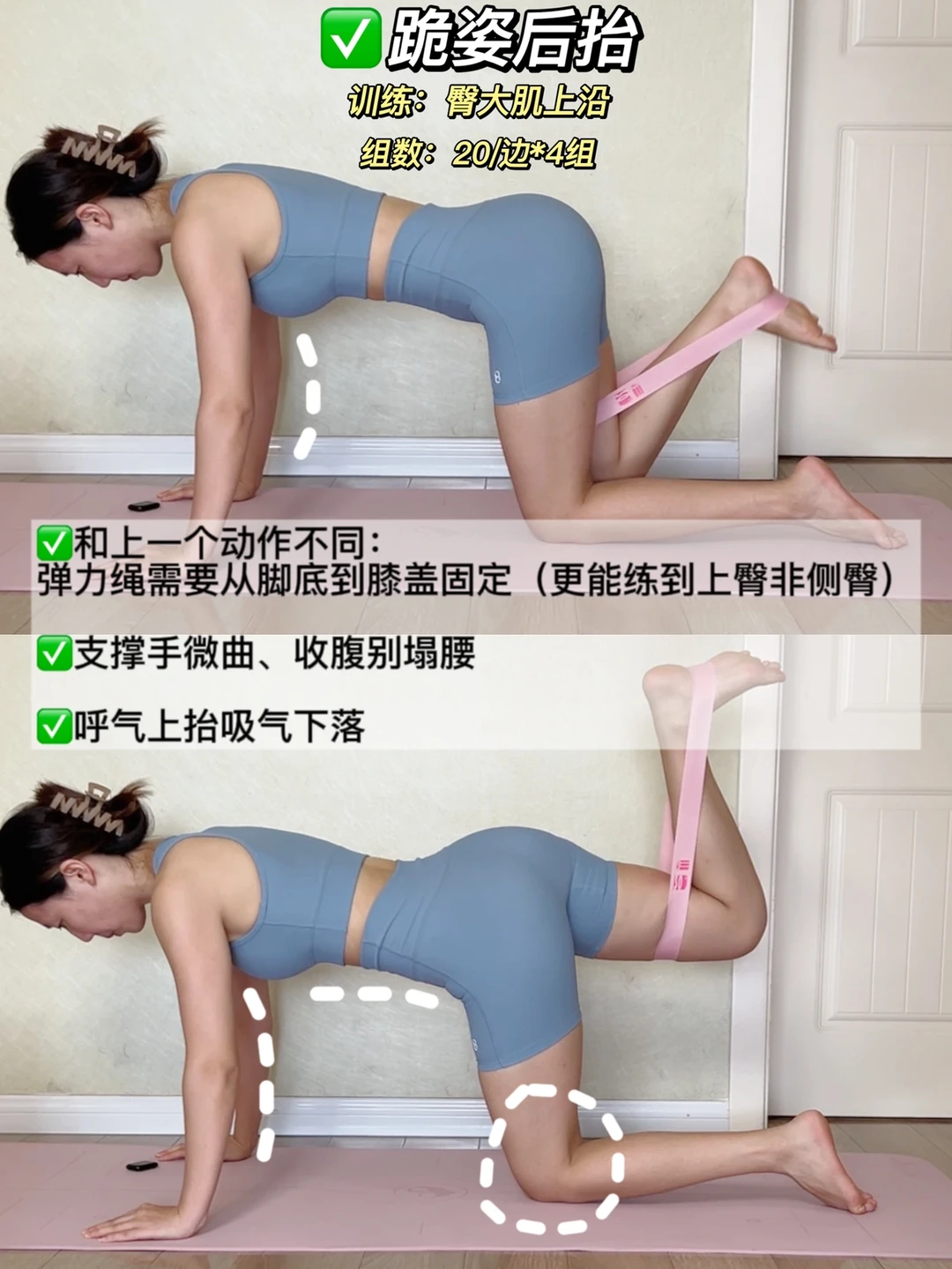 ⚠️记住全程都是臀带腿,而且不要翻胯,做慢一点更能感受上臀发力(真的是绑根弹力绳做20个,上臀就隐隐发酸了[笑哭R])