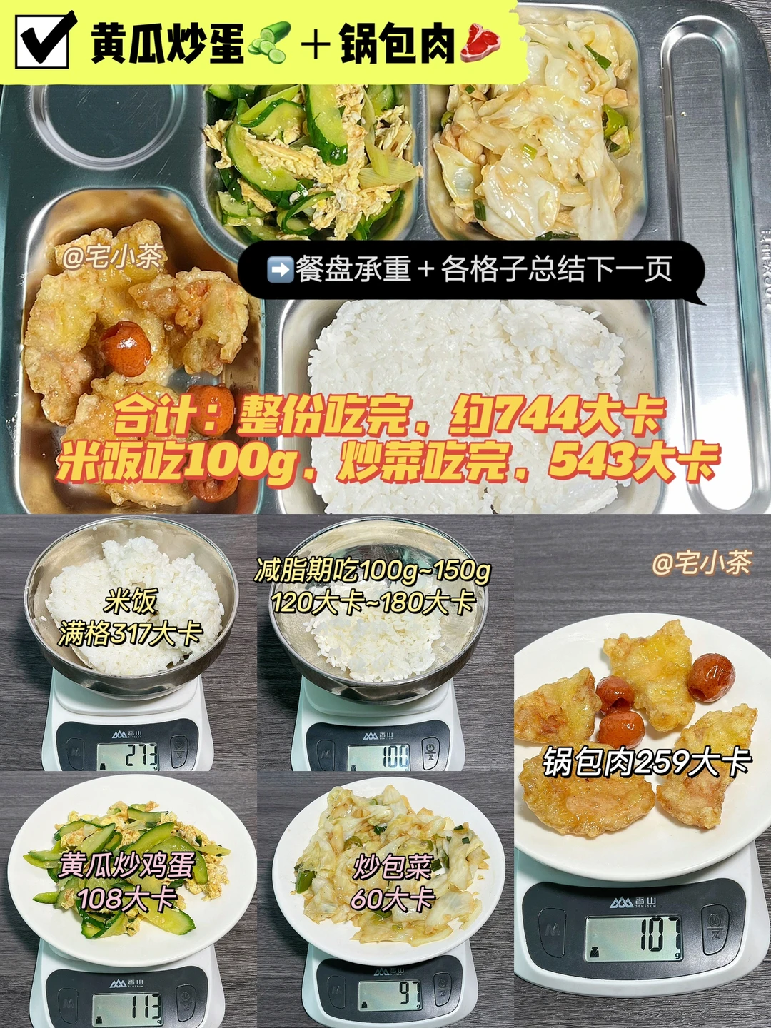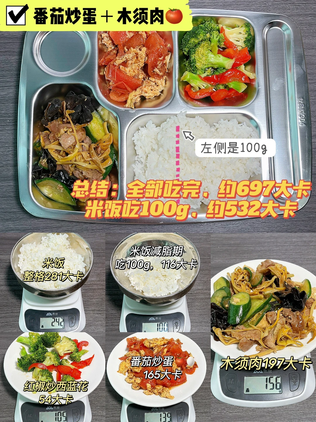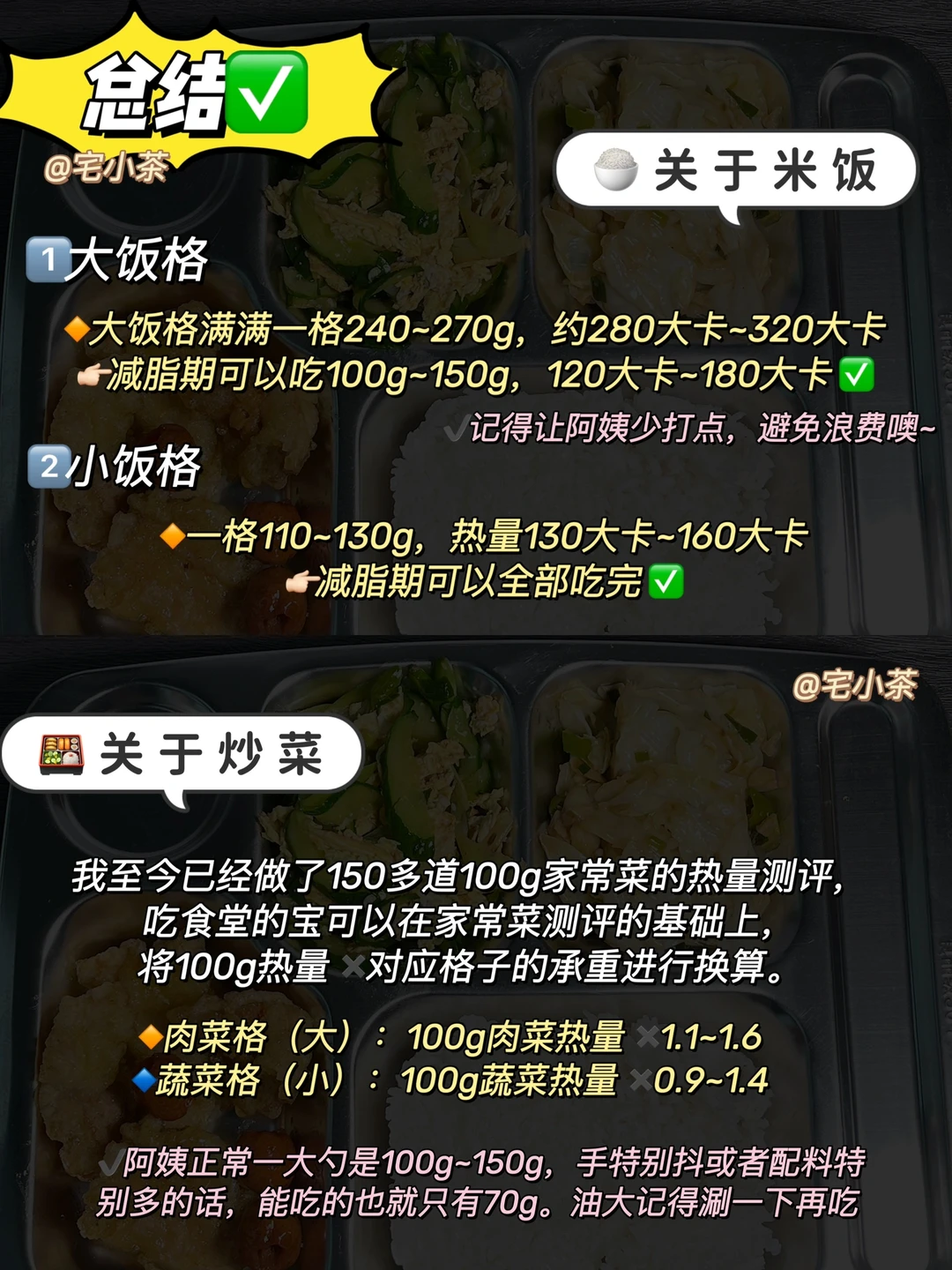 我至今已经做了150多道100g家常菜的热量测评,吃食堂的宝可以在家常菜测评的基础上,将100g热量✖️对应格子的承重进行换算。