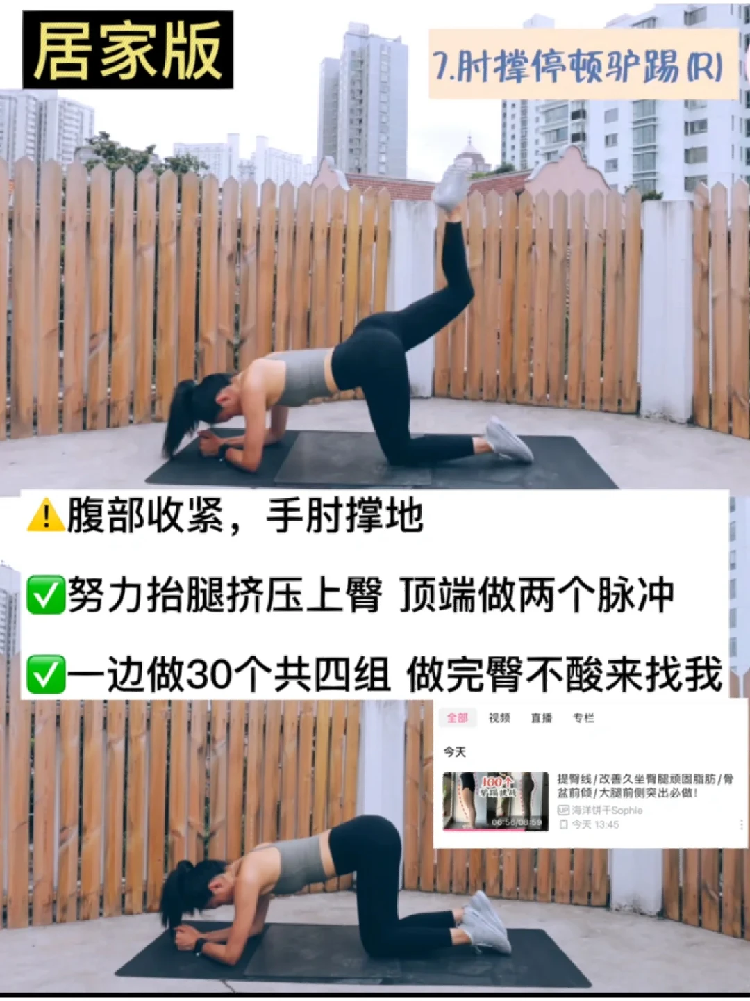 做完驴踢以后其实已经臀部“蓬”起来了,如果当天状态还行我就会拿着10kg的哑铃或者弹力带跟着练~