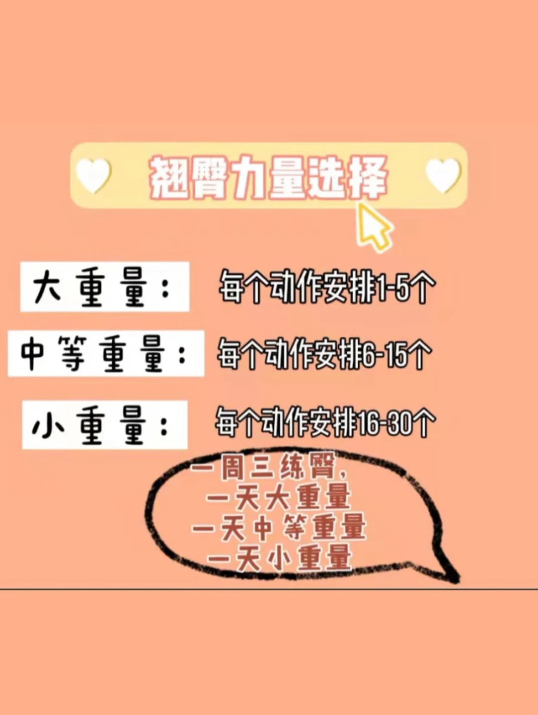 如果你一周三次练臀,那么应该是一天大重量(个数只能1-5个),一天中等重量(个数在6-15个),一天小重量(个数在16-30个),不同的重量搭配不同的动作相信你很快就能练出翘翘蜜桃臀