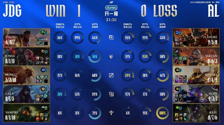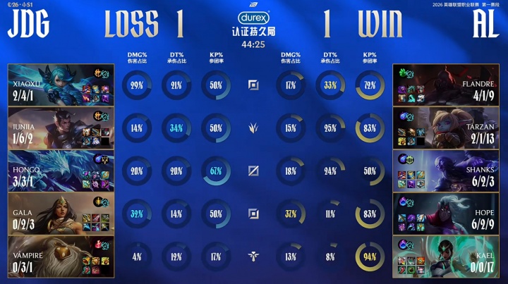 直播吧1月18日讯LPL第一赛段组内赛JDG二比一击败AL,值得一提的是三局比赛圣枪哥表现连续被xiaoxu压制,圣枪哥仅第二局塞恩打出了正战绩。