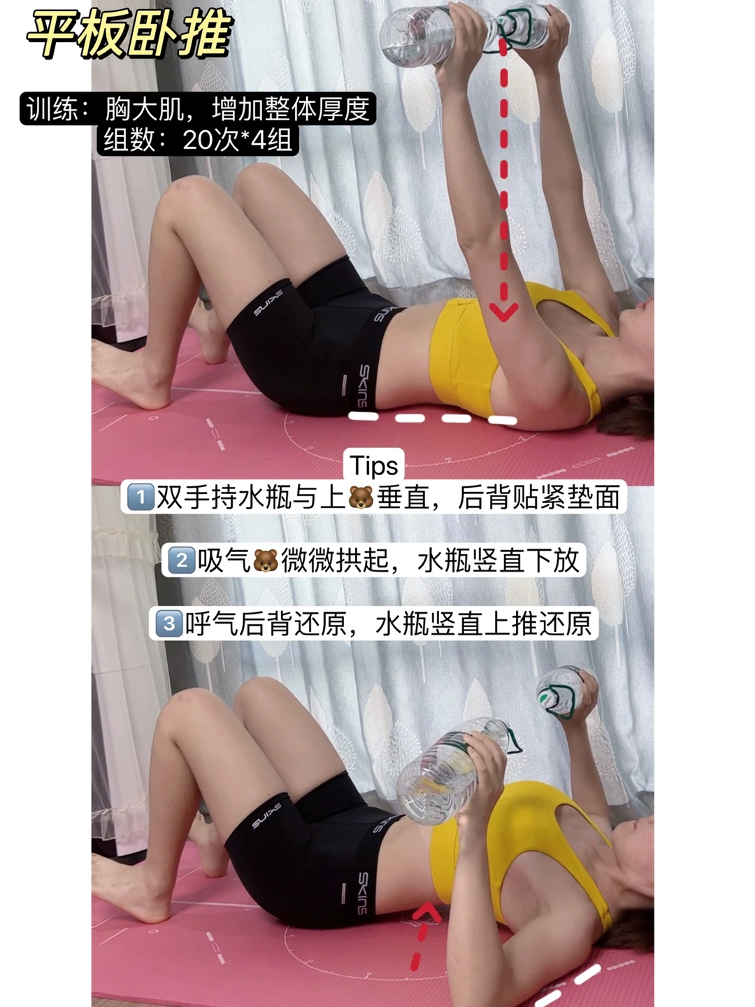 以下是居家版的练胸,比较适合弹力绳找不准发力感的新手姐妹~躺在瑜伽垫拿两个小哑铃或者矿泉水即可!