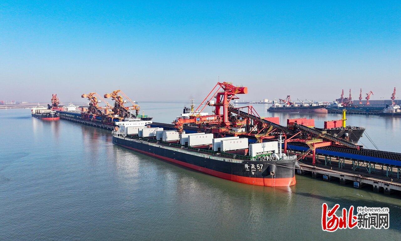 1月12日,在黄骅港煤炭港区,自动装船机将煤炭输送到货船上。