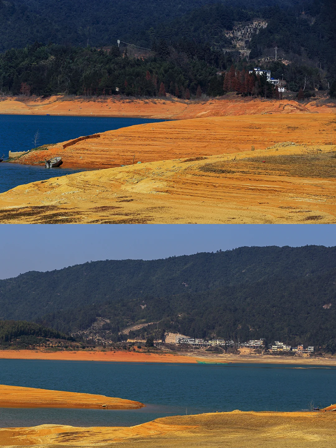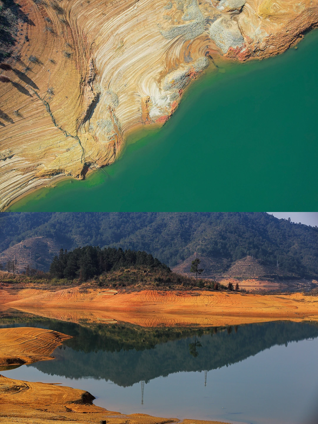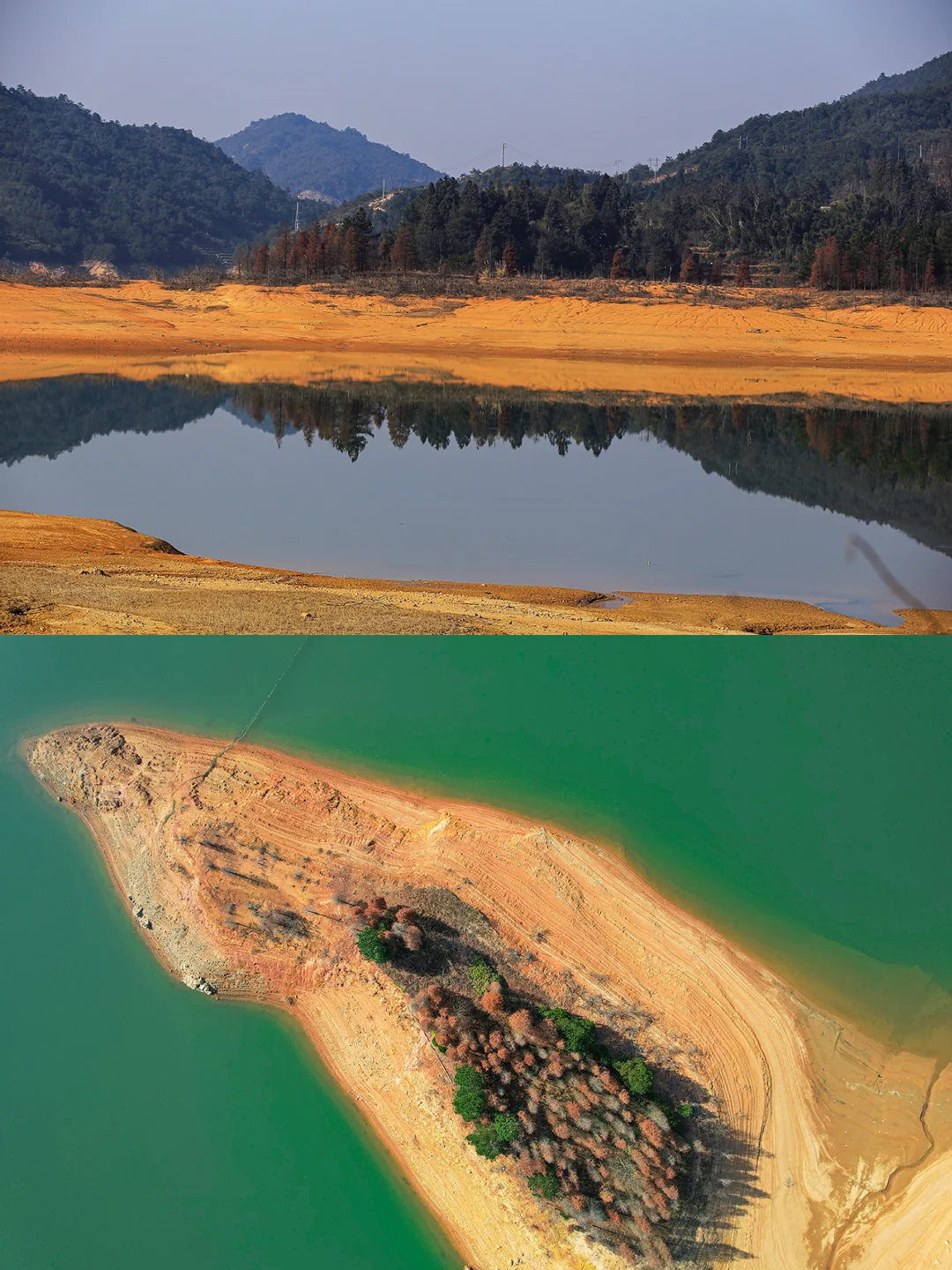 ✅潭岭天湖水库,是广东境内海拔最高的水库,看湖水颜色就知道了,无人机视角是绿色,单反视觉是蓝色,加上冬季湖水下降,湖边的黄泥土呈现出五彩斑斓,从远处看,非常有线条感,有一种在西藏阿里、大西北的感觉。