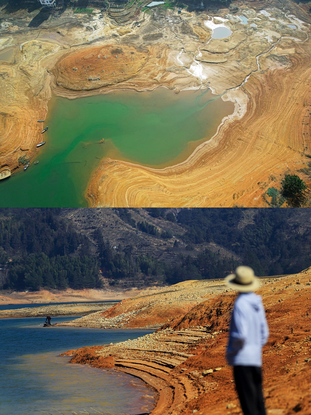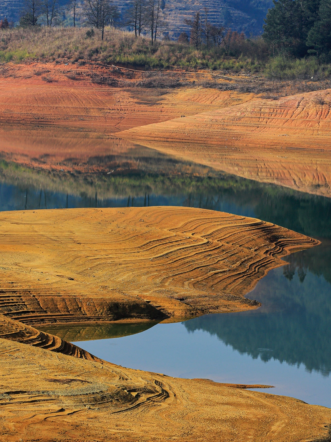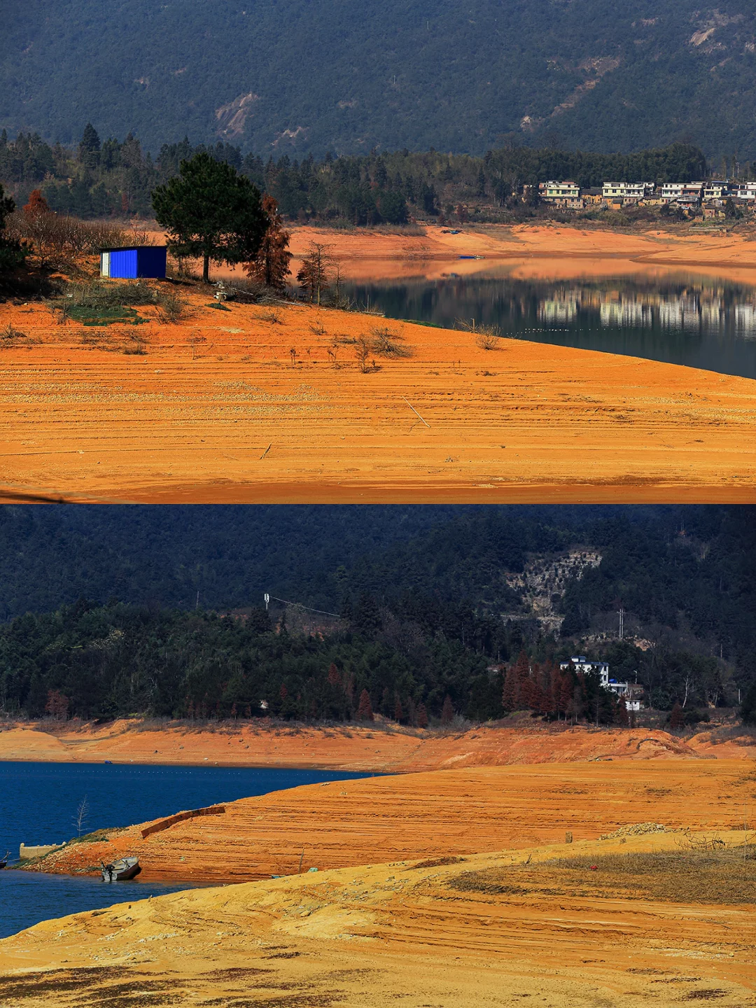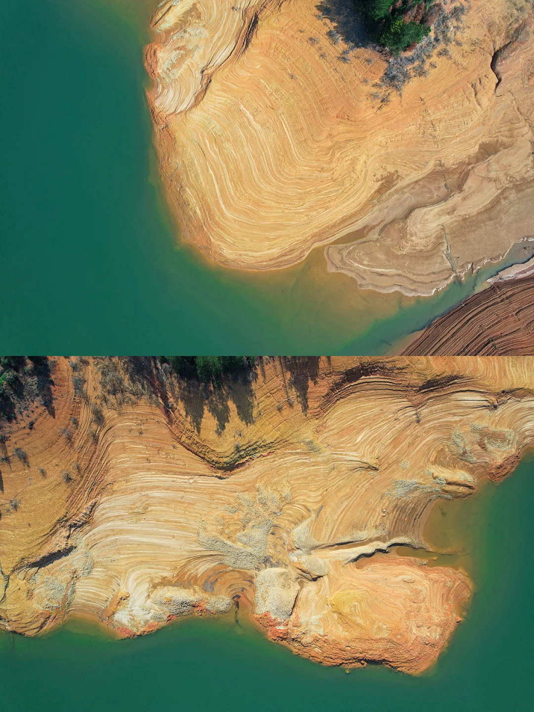 ✅潭岭天湖水库,是广东境内海拔最高的水库,看湖水颜色就知道了,无人机视角是绿色,单反视觉是蓝色,加上冬季湖水下降,湖边的黄泥土呈现出五彩斑斓,从远处看,非常有线条感,有一种在西藏阿里、大西北的感觉。