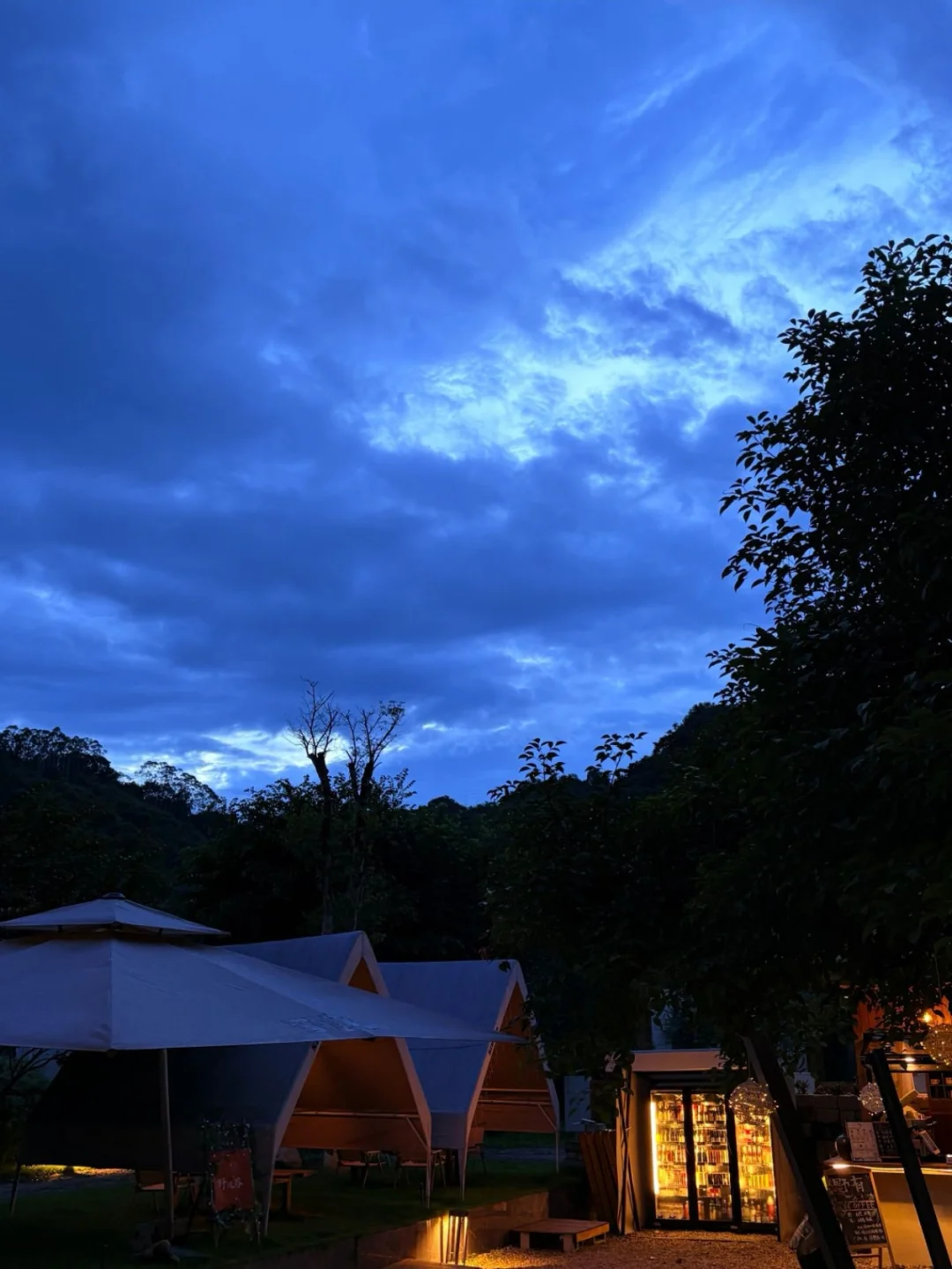 等暮色再沉一些,天空就会慢慢晕开一层治愈的克莱因蓝,露营区的帐篷亮起暖黄的灯,橱窗里的饮料在蓝调时刻里闪着细碎的光,风里都裹着松弛的味道。
