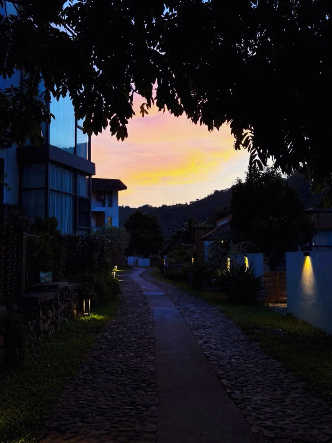 当橘色晚霞把天空烧得发烫,石板路被落日镀上暖光,这是野渡谷的日落限定🌄。