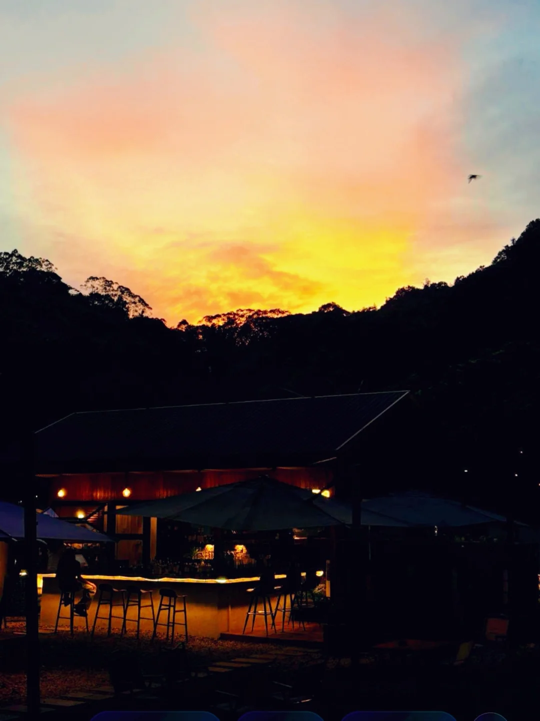 ▫️蓝调时刻:日落后15-20分钟,露营区和吧台前的暖光与蓝调天空超出片